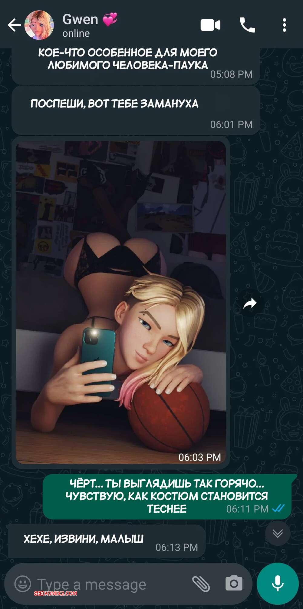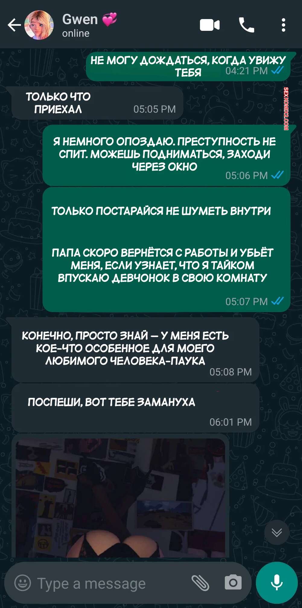 Порно комикс Marvel. Паук Гвен. Spider Gwen. eskand art. Красотка Гвен отправляет отцу Майлза откровенные фотографии и приглашает его к себе. Сучка отсосала большой хуй темнокожего мужика, после чего дала ему себя трахнуть.