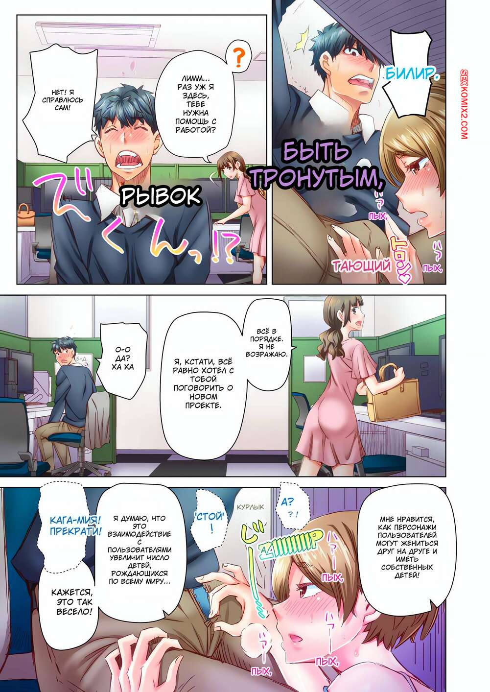 Порно комикс Выходи за меня замуж. Без цензуры. Часть 58 и 59 и 60 Парень был занят работой, а горячая брюнетка хотела секса. Она залезла под стол и стала сосать его большой хуй, после чего парнишка усадил ее на стол и стал лизать ее пизду.