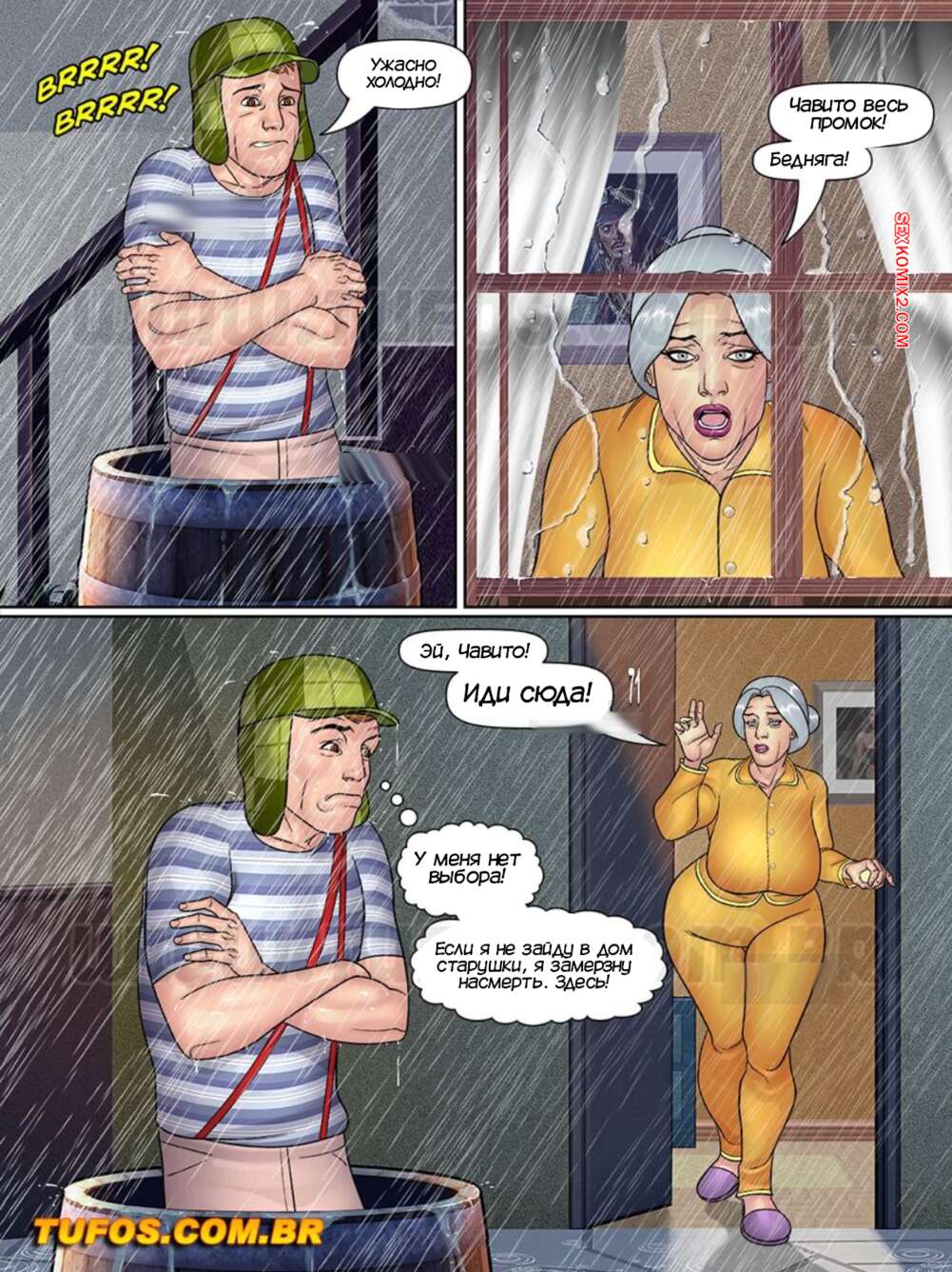 Порно комикс Чавиньо. Часть 3. Chavitoon. Tufos Чавиньо попал под ливень и красотка милфа позвала его к себе домой, чтобы согреть. В душе она была поражена большим членом парня и стала у него отсасывать, после чего дала выебать свою пизду.