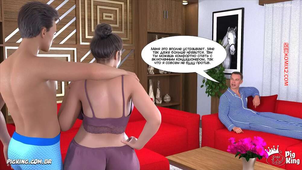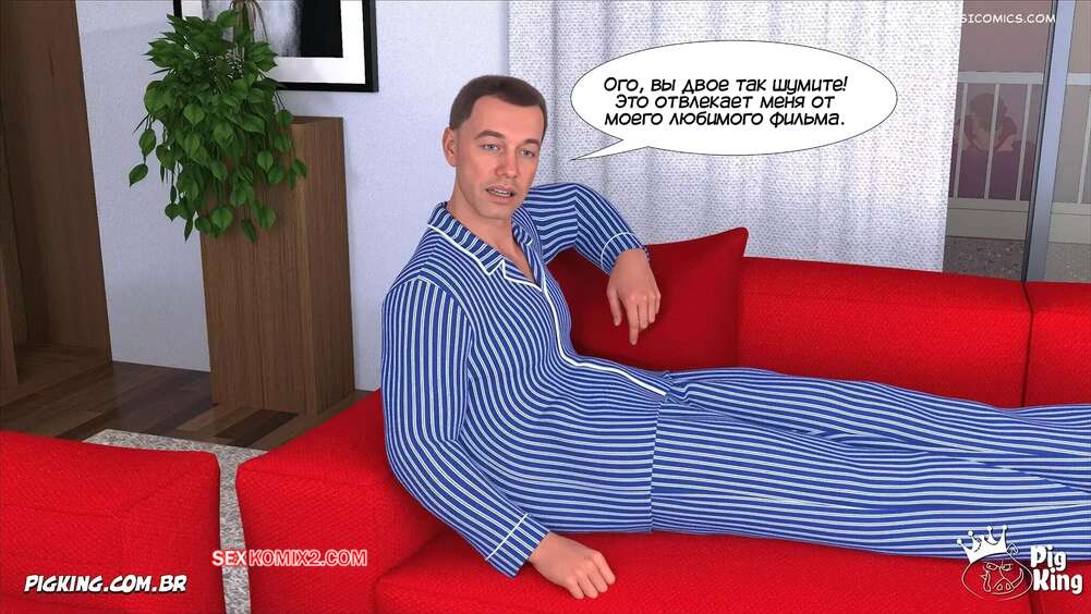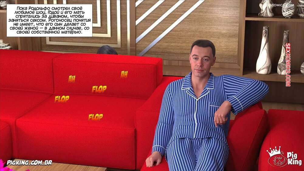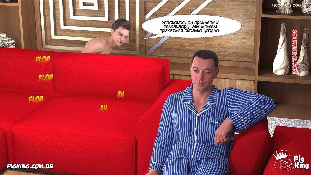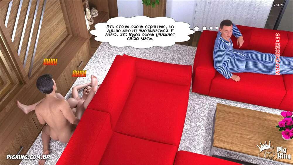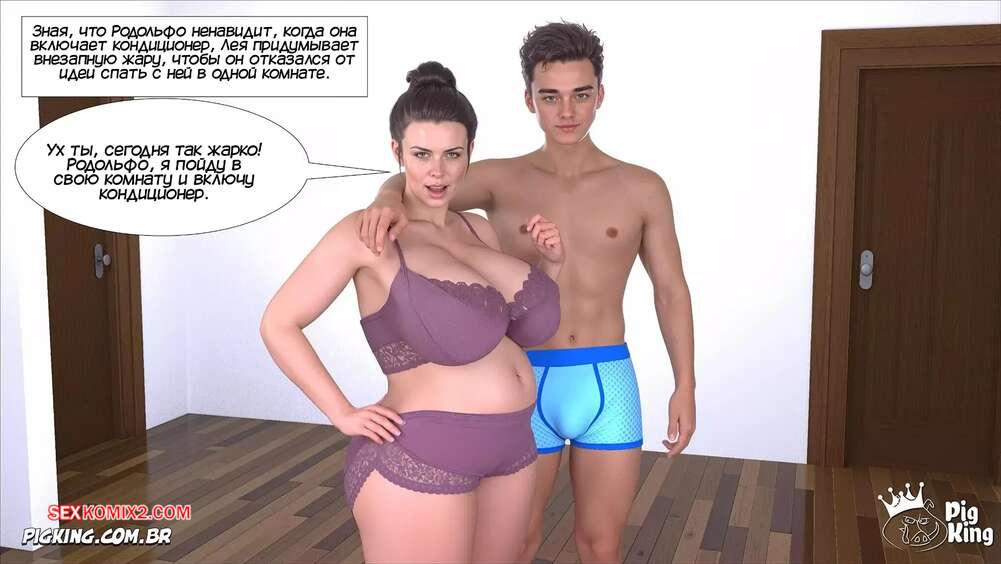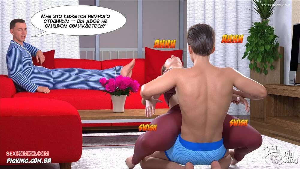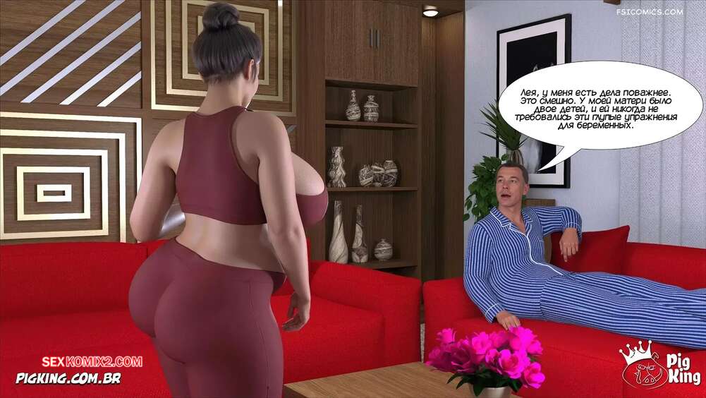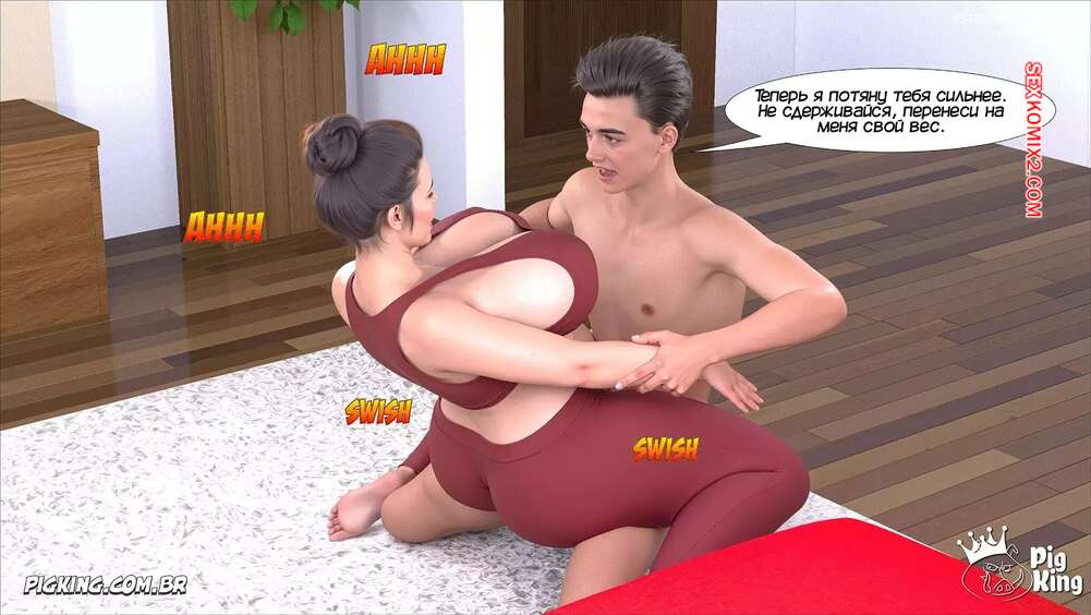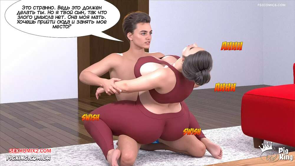 Порно комикс Ошейник. Часть 10. The Collar. PigKing Красотка Лея просит мужа помочь ей в упражнениях для беременных, но он увлечен просмотром телевизора. К красотке на помощь пришел ее сын Годой, который трахнул мамочку, пока его отец был совсем рядом.