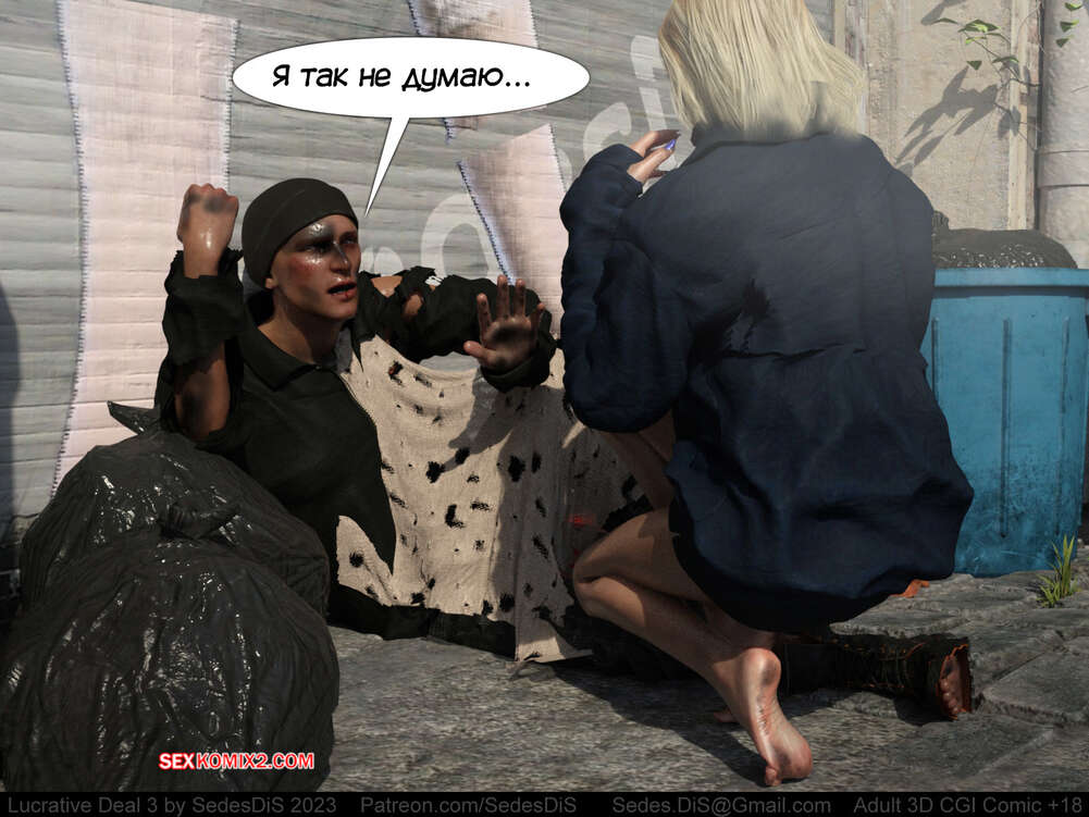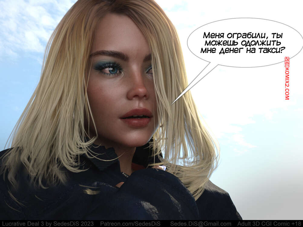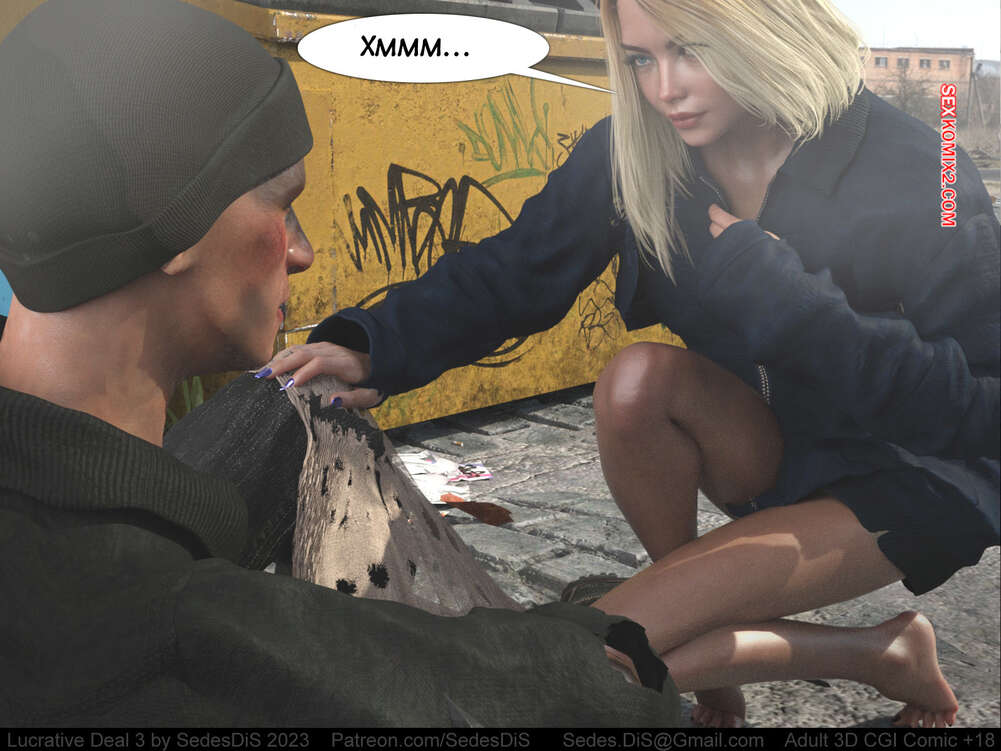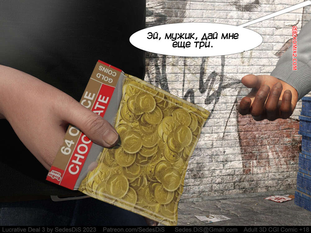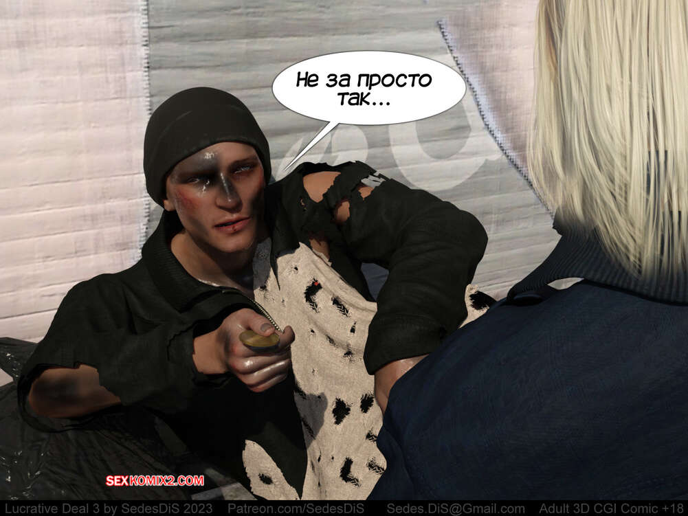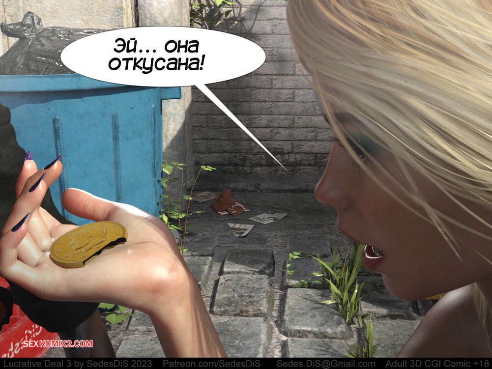 Порно комикс Выгодная сделка. Часть 3. Lucrative Deal. SedesDis Блондиночка обратилась к бездомному парню с просьбой о помощи деньгами и он показал ей золотую монету. Девушка стала ему отсасывать и дала себя выебать, но взамен получила лишь шоколадную монету.