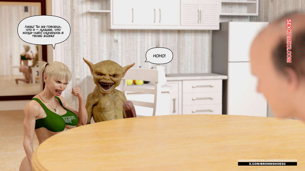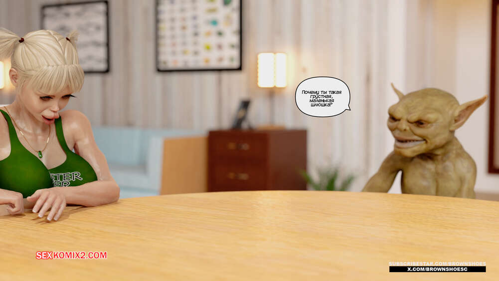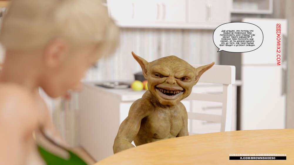 Порно комикс Гнездо гоблинов. Часть 12. Goblins Nest. Brown Shoes Зоку соблазняет Алису своим огромным членом. Красотка не может сдерживать похоть и встает на колени, чтобы отсосать огромный хуй гоблина, что очень не нравится Эшу.