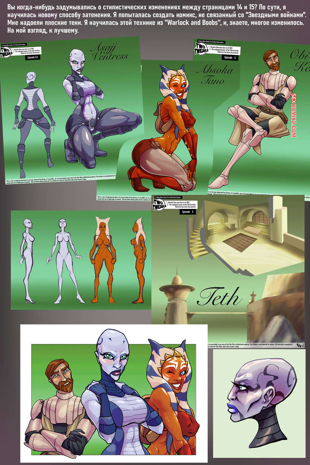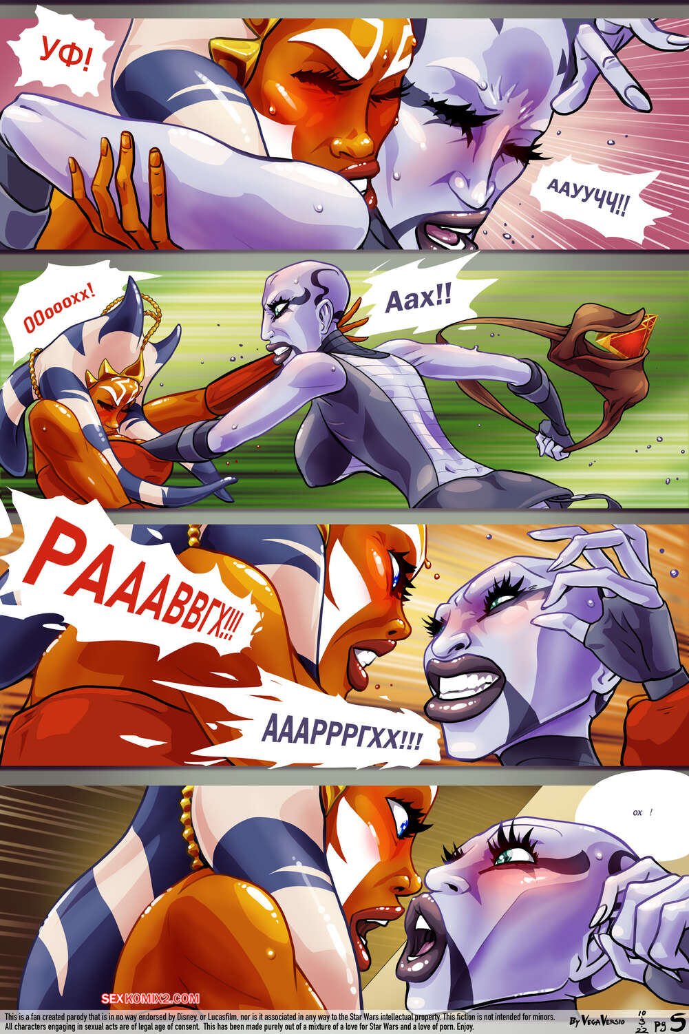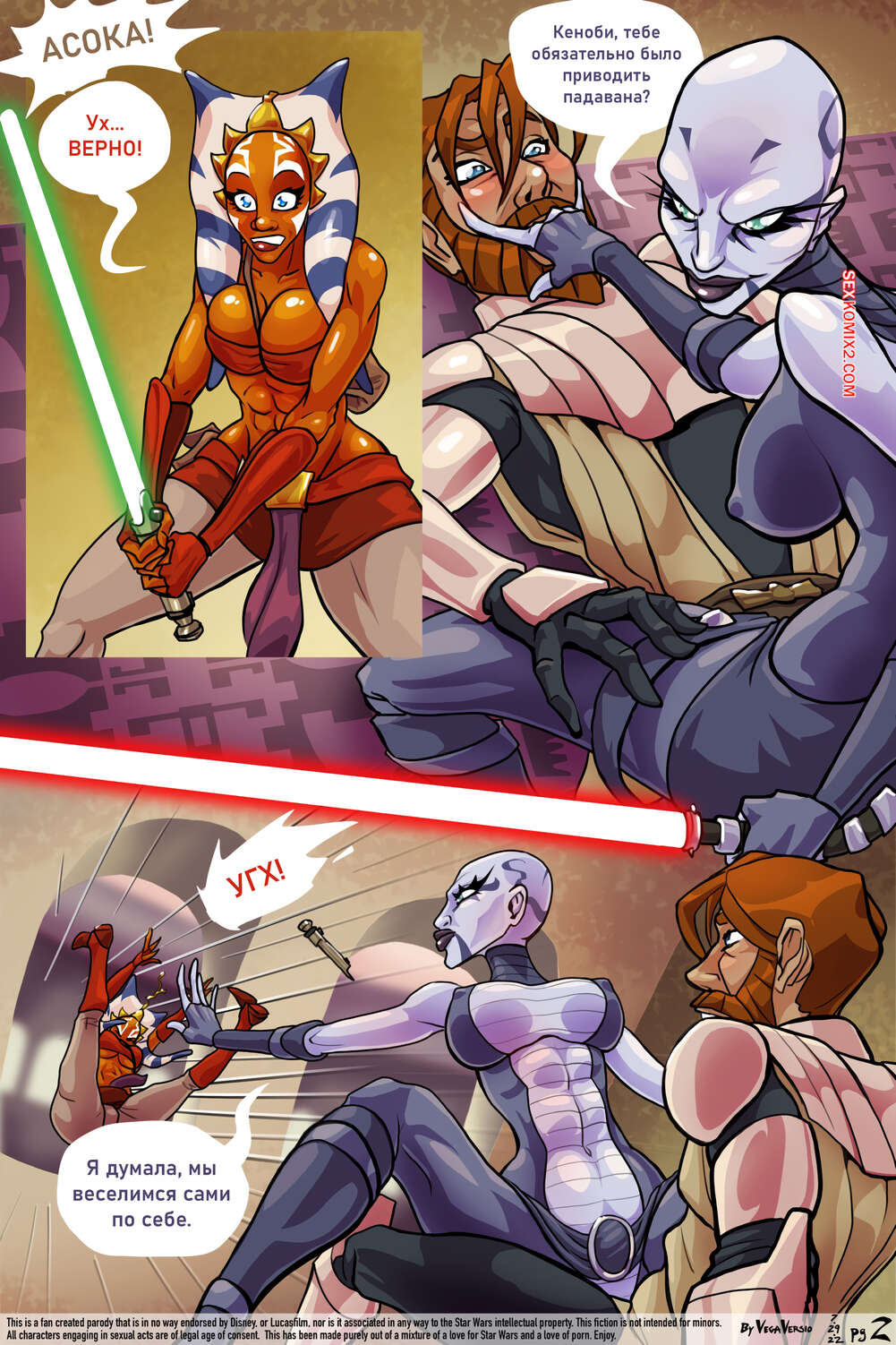Порно комикс Звездные войны. Две настройки. Эпизод 5. Two Tweaks. VegaVersio Асока Тано не может сдерживать свою похоть и решает повеселиться со злодейкой. Она поставила ее на колени и дала отсосать свой большой хуй, после чего выебала ее пизду.