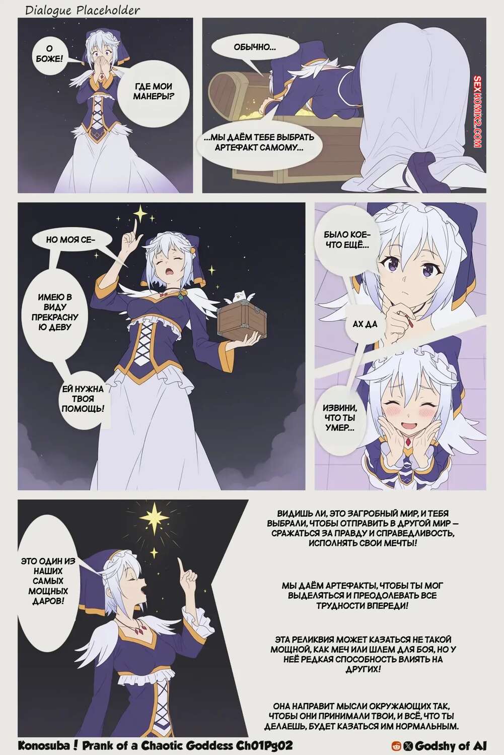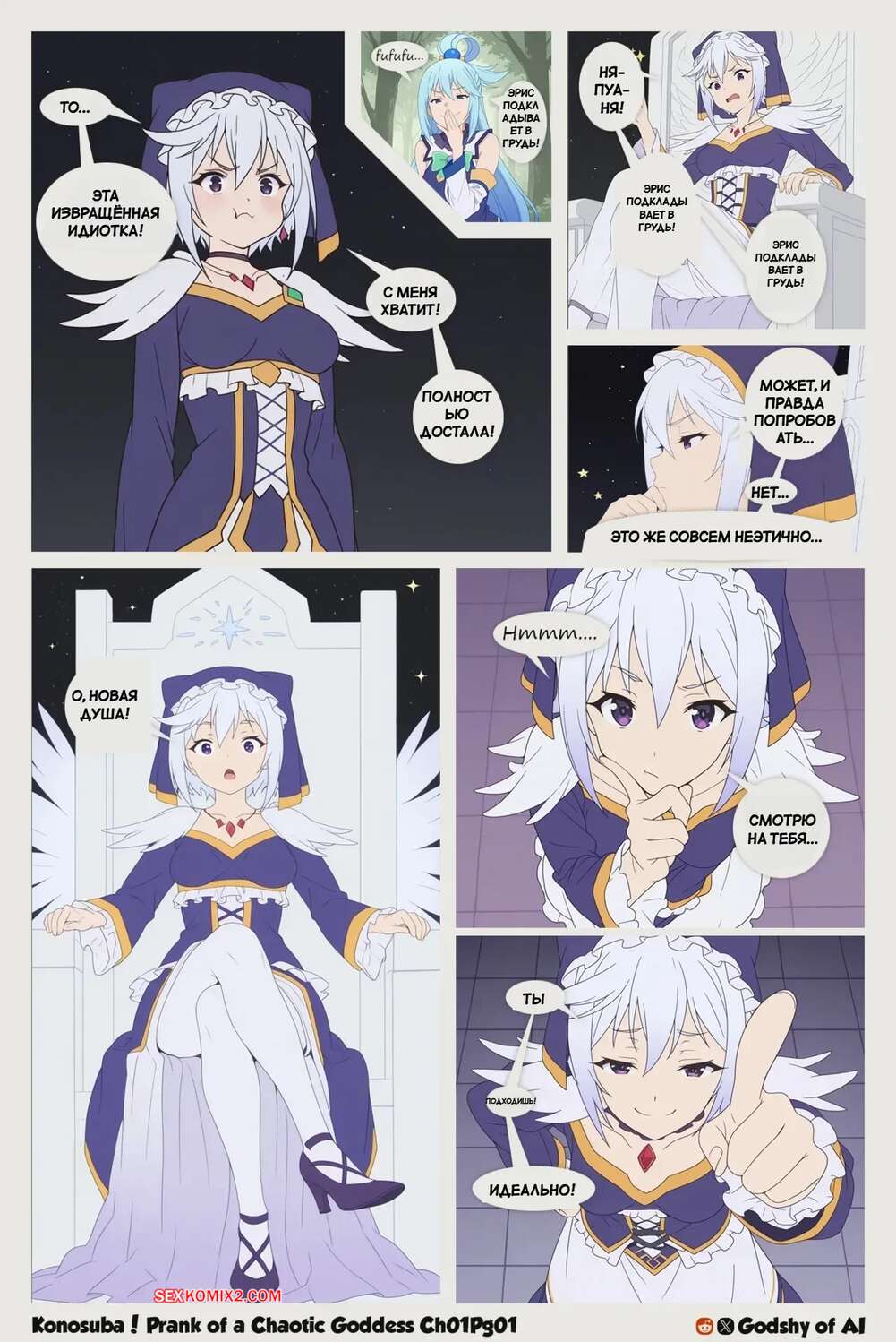Порно комикс Konosuba. Шутка хаотичной богини. Prank Of a Chaotic Goddess. Godshy Of AI. Горячая блондинка испытывает возбуждение и решает пошалить с парнем. Она встала на колени и стала ласкать его член, после чего оседлала парня и дала себя выебать.