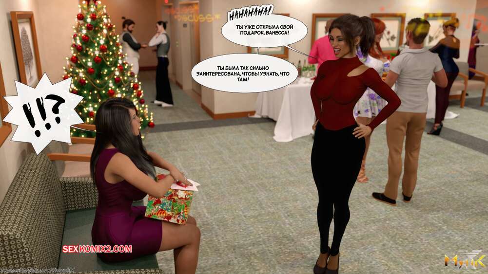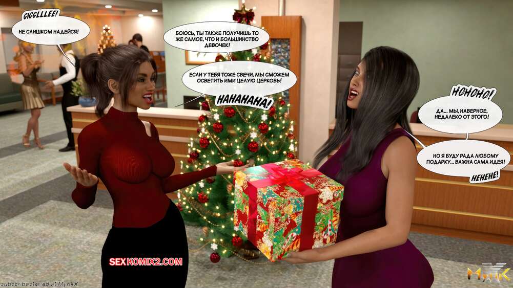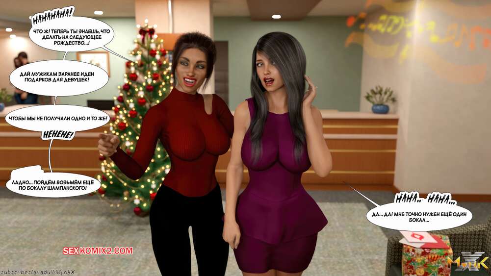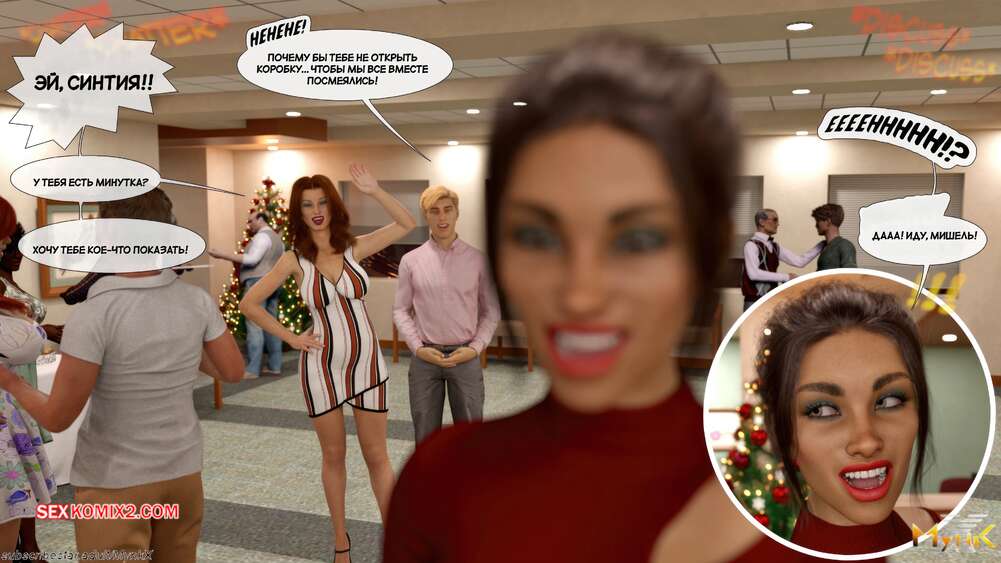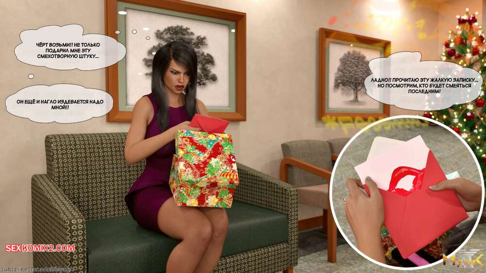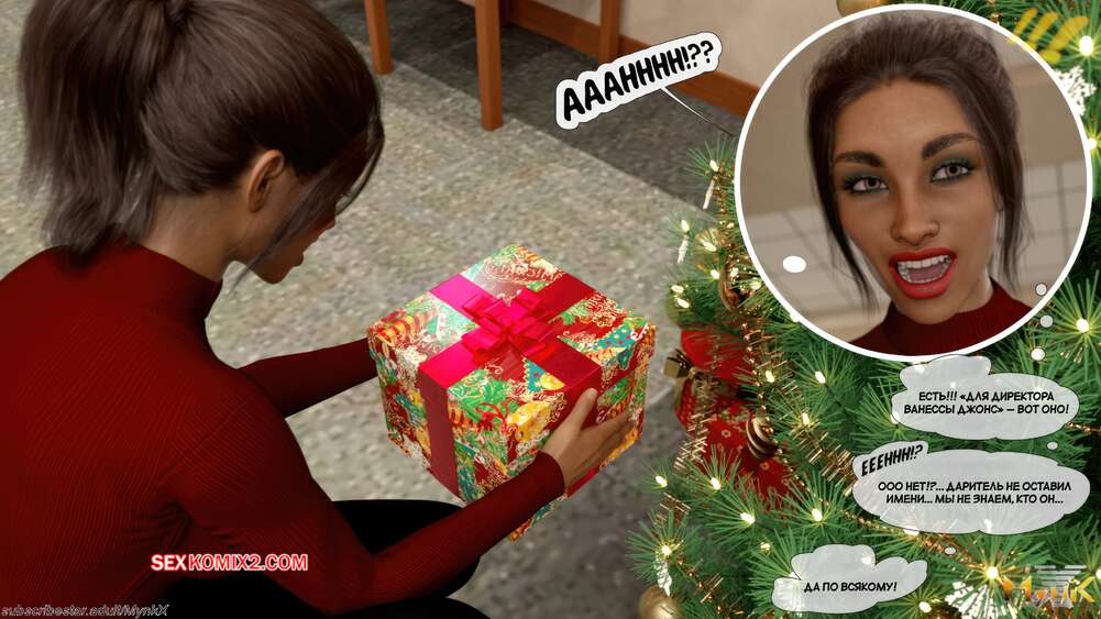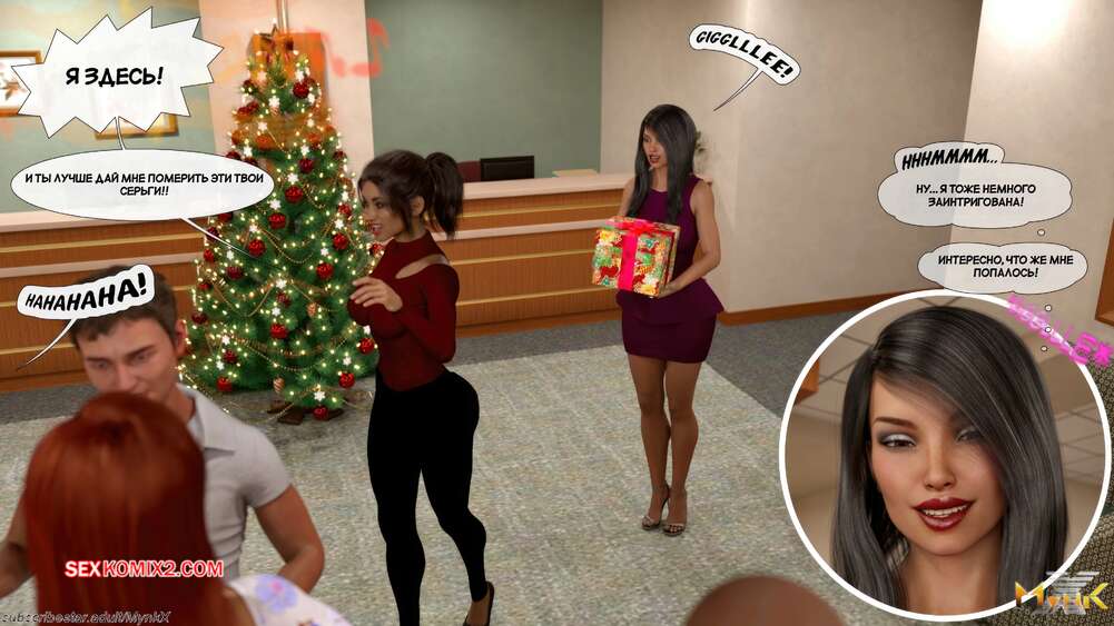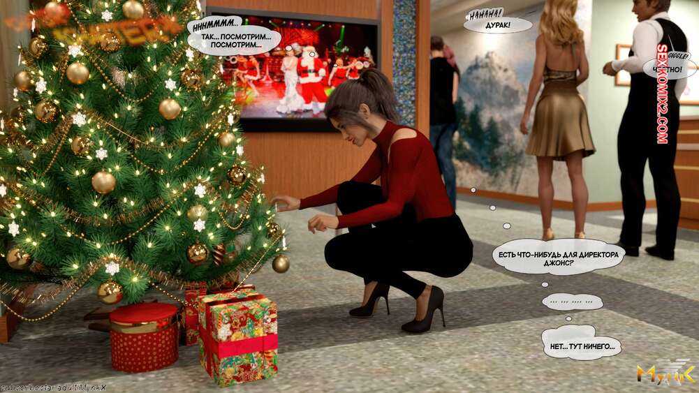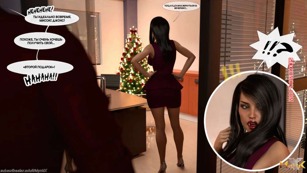 Порно комикс Развратное рождество. Часть 2. A Naughty Christmas. Mynkx Парень в маске ворвался в офис к горячей брюнетке и стал ее угрожать. Он достал член и поставил сучку на колени, чтобы она ему отсосала, после чего он выебал ее пизденку.