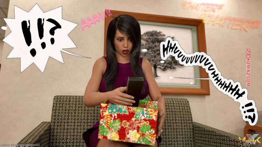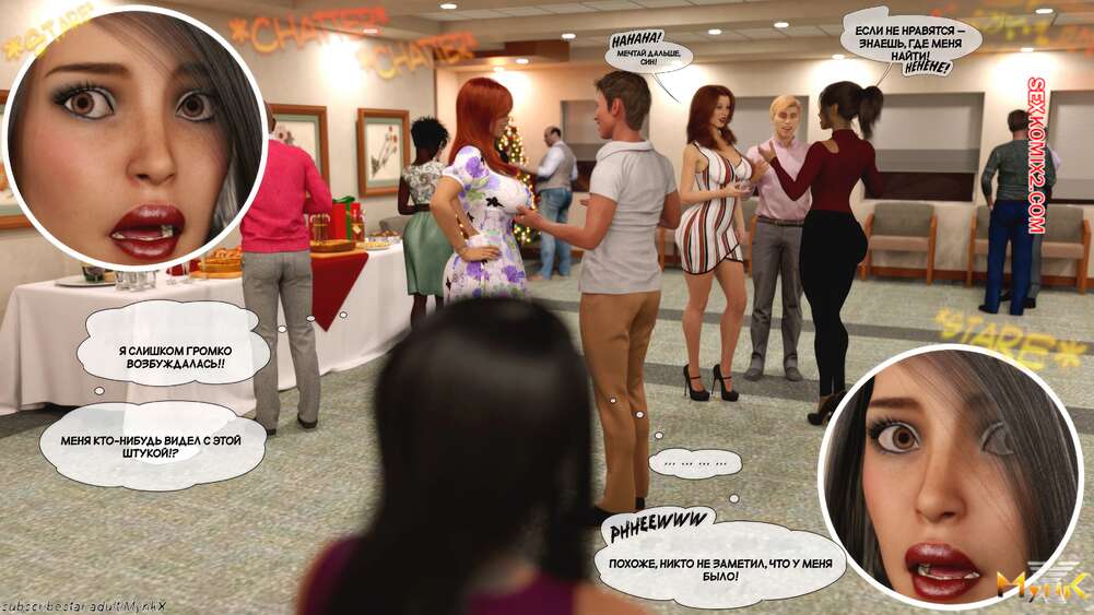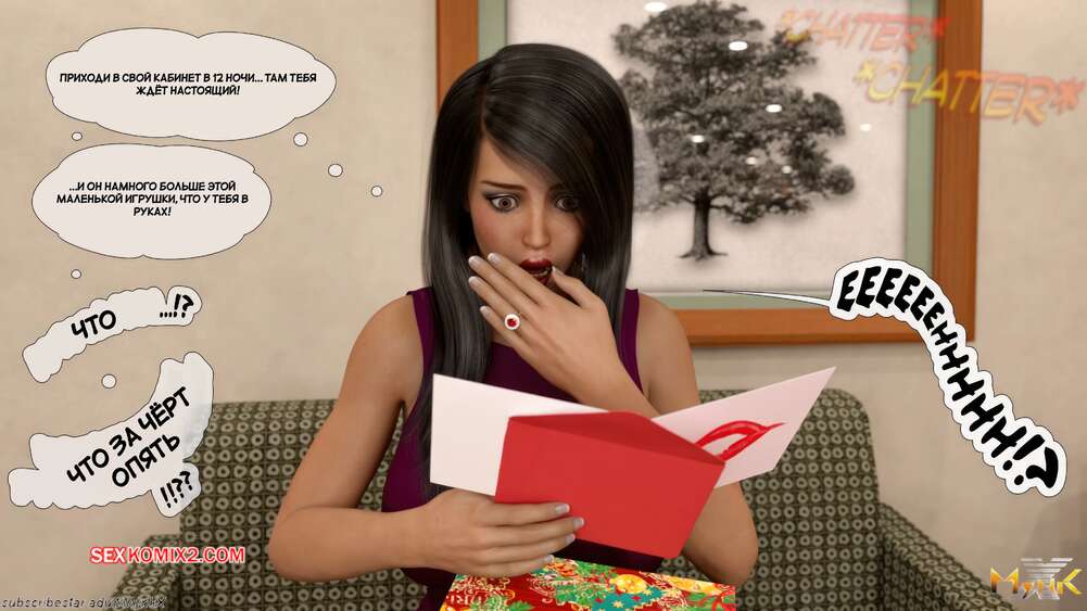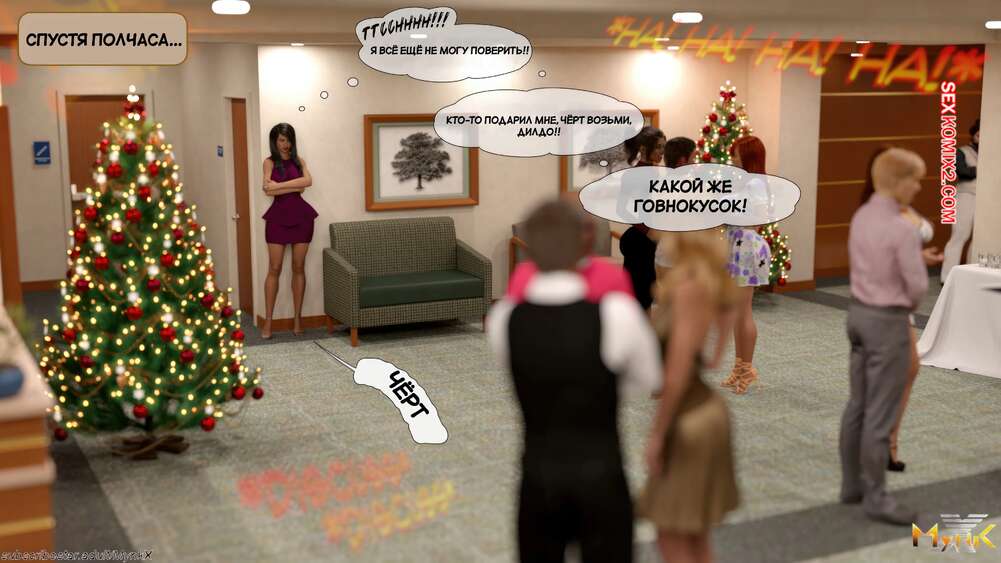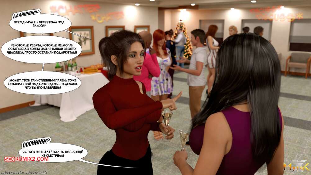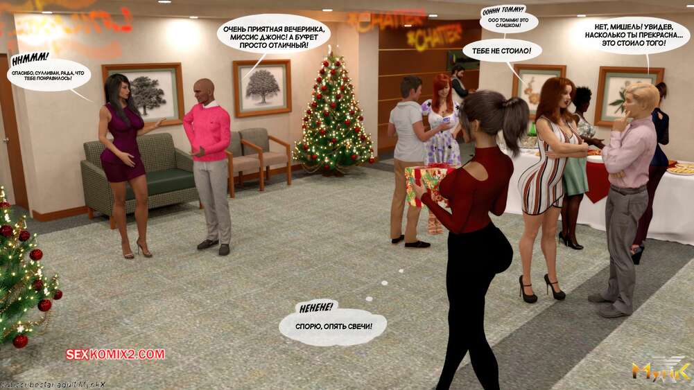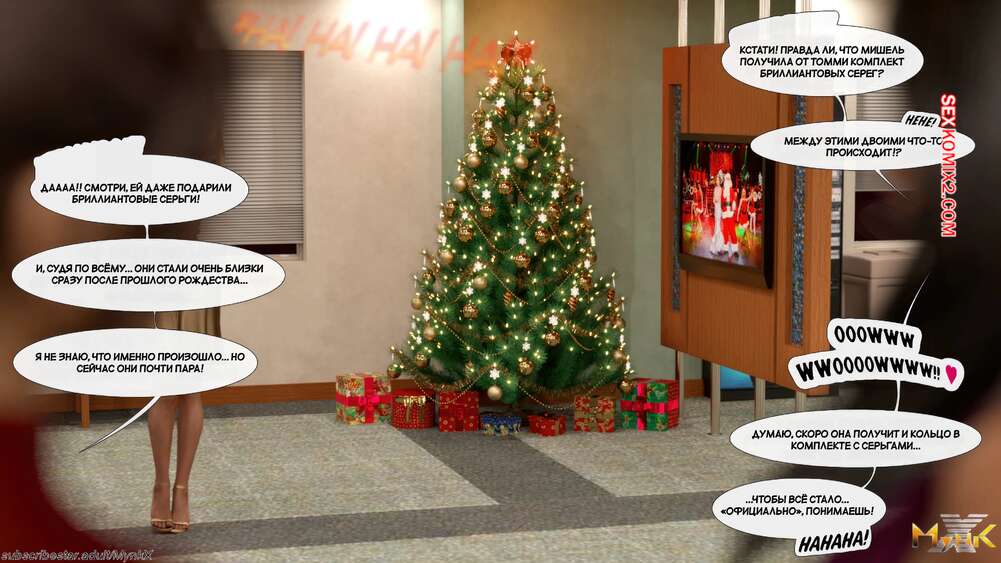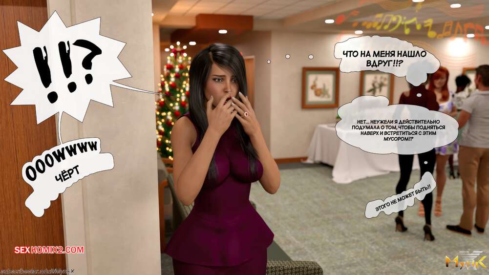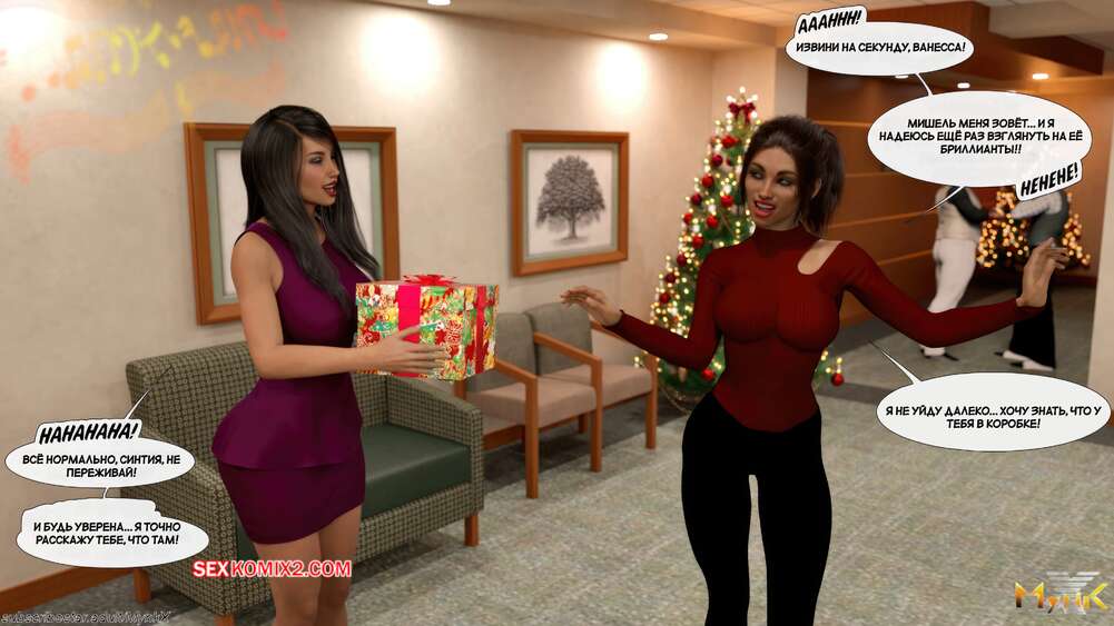 Порно комикс Развратное рождество. Часть 2. A Naughty Christmas. Mynkx Парень в маске ворвался в офис к горячей брюнетке и стал ее угрожать. Он достал член и поставил сучку на колени, чтобы она ему отсосала, после чего он выебал ее пизденку.