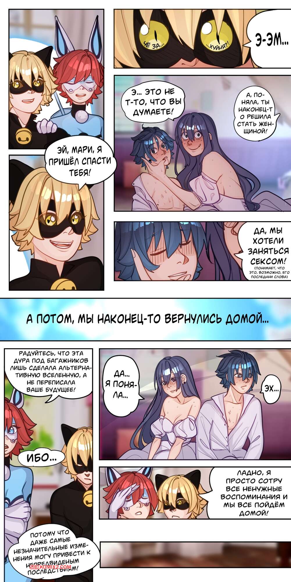 Порно комикс Miraculous Ladybug. Альтернативная Вселенная. Cogamori Красотка перебрала с алкоголем и потащила своего дружка в спальню, желая пошалить. Она раздвинула ножки и дала ему себя хорошенько выебать и заполнить ее киску спермой.