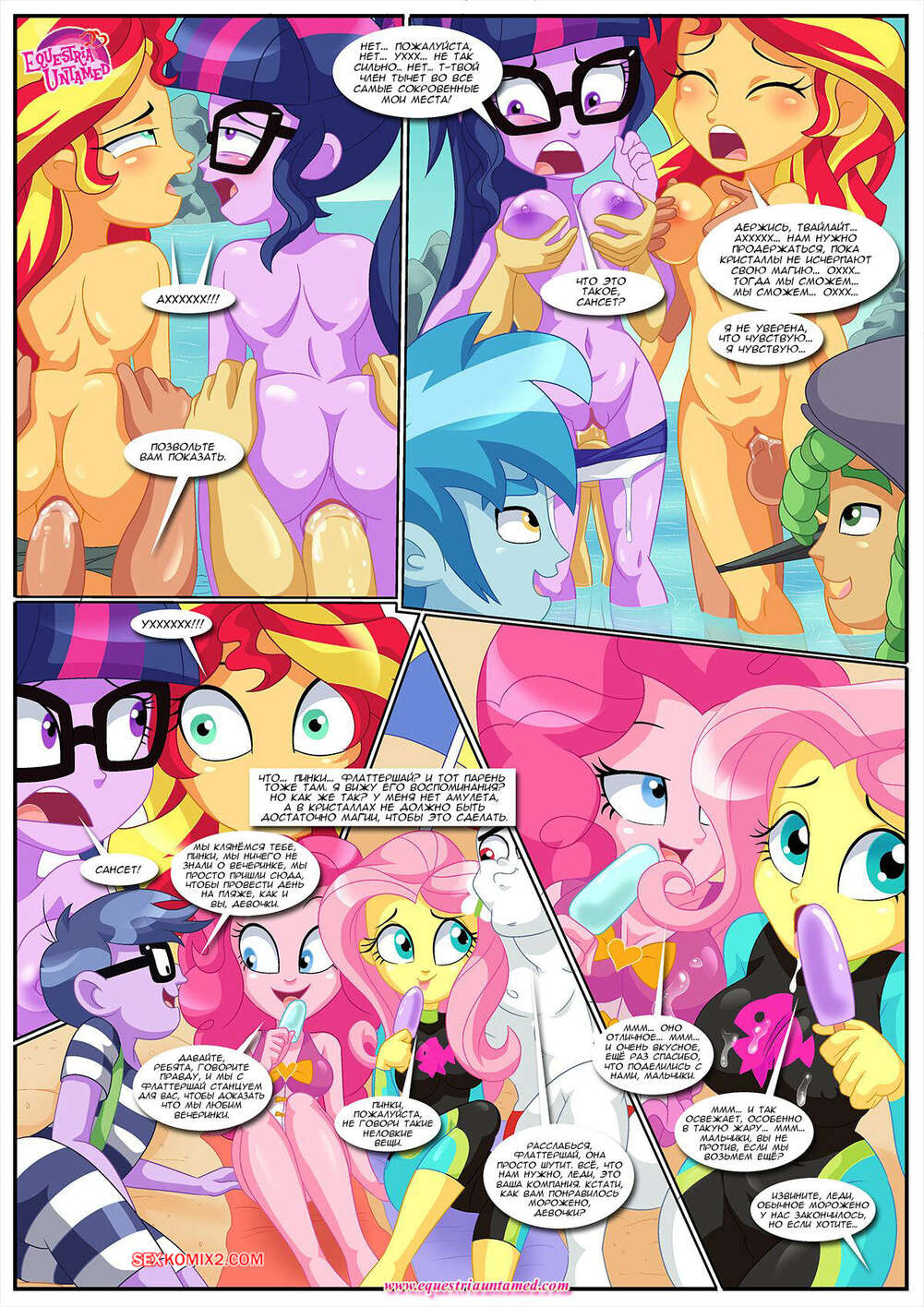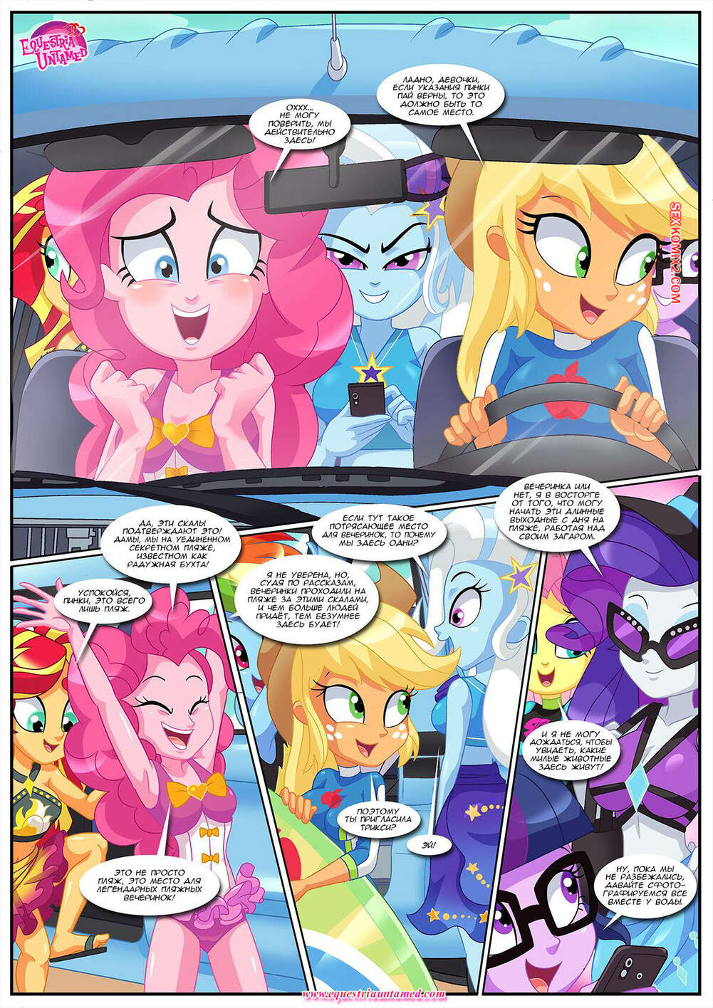 Порно комикс My Little Pony. Вечеринка в Радужной Бухте. Party At Rainbow Cove. Palcomix Горячие красотки пони отправились на пляж со своими дружками, желая там пошалить. Девушки соблазнили парней и стали сосать их члены, после чего раздвинули ножки и дали себя выебать во все дырочки.