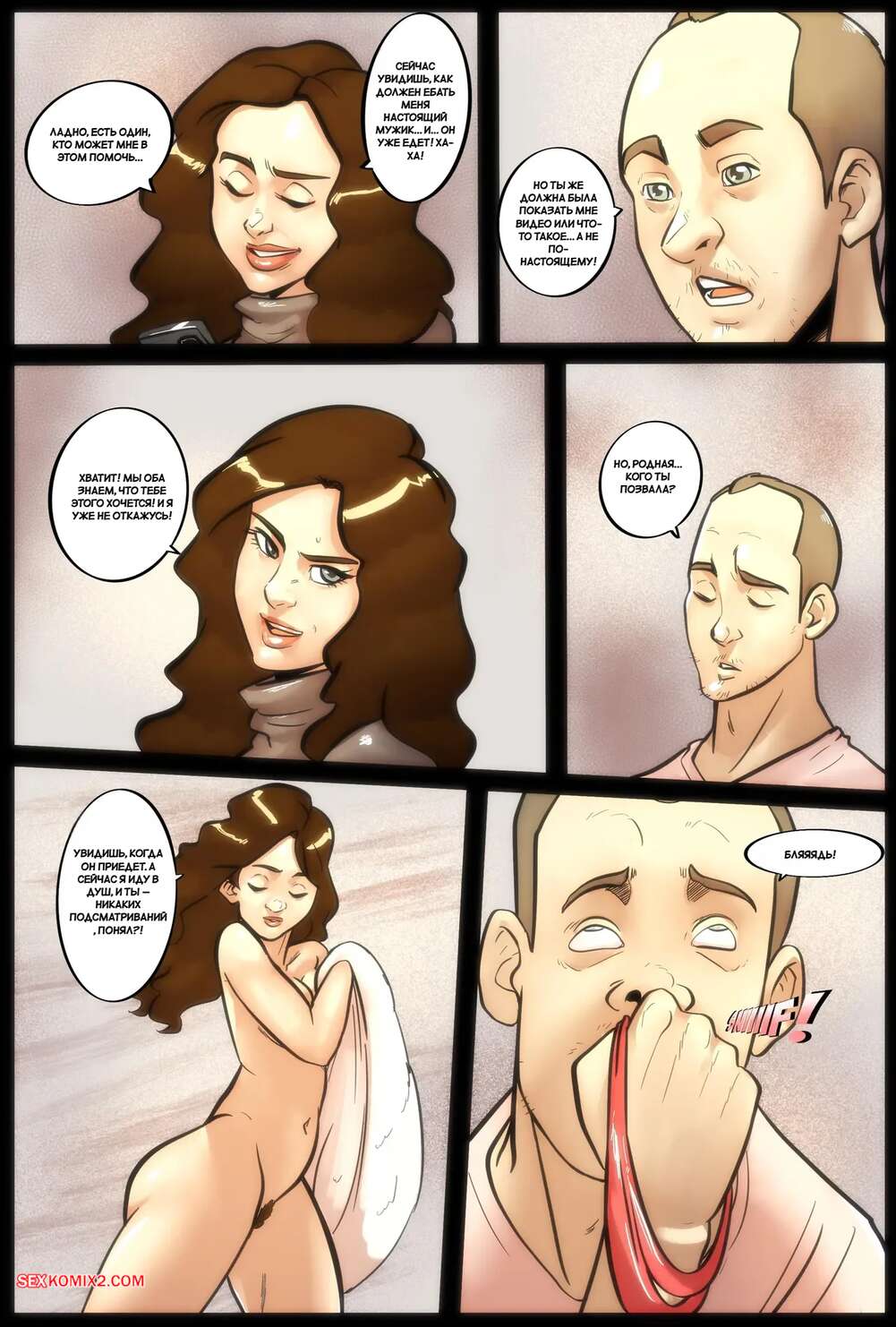 Порно комикс Настоящий мужчина для моей жены. A Real Man For My Wife. Illustravitor. Горячая милфа не довольна членом своего мужа, поэтому решила найти себе любовника. Она сосет его член и раздвигает ножки, чтобы парень ее выебал, пока ее муж за этим наблюдает.