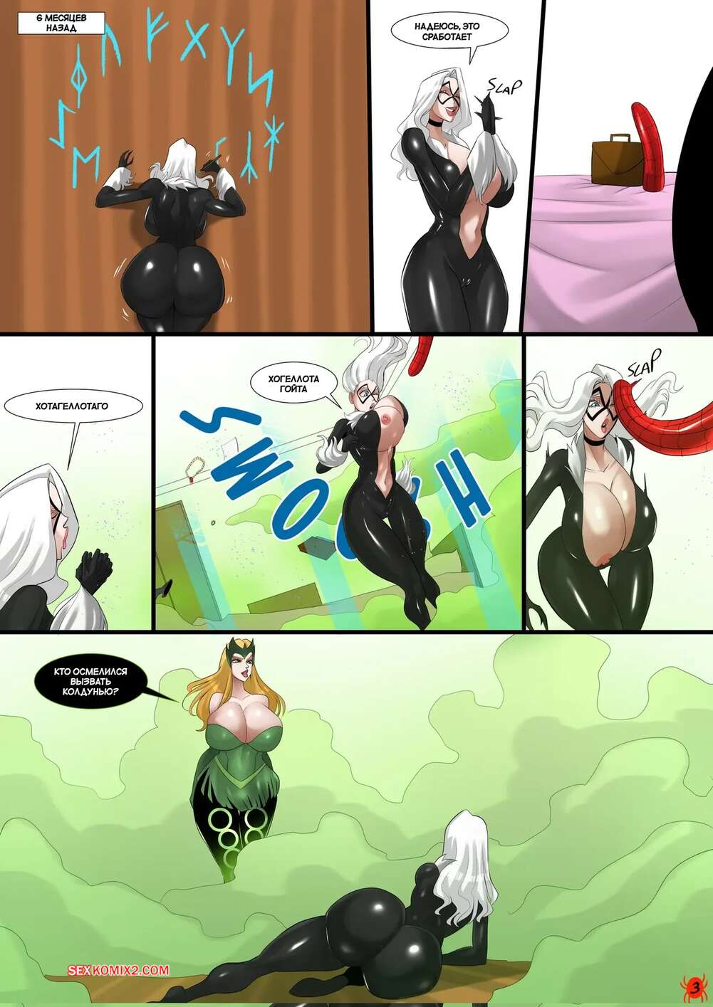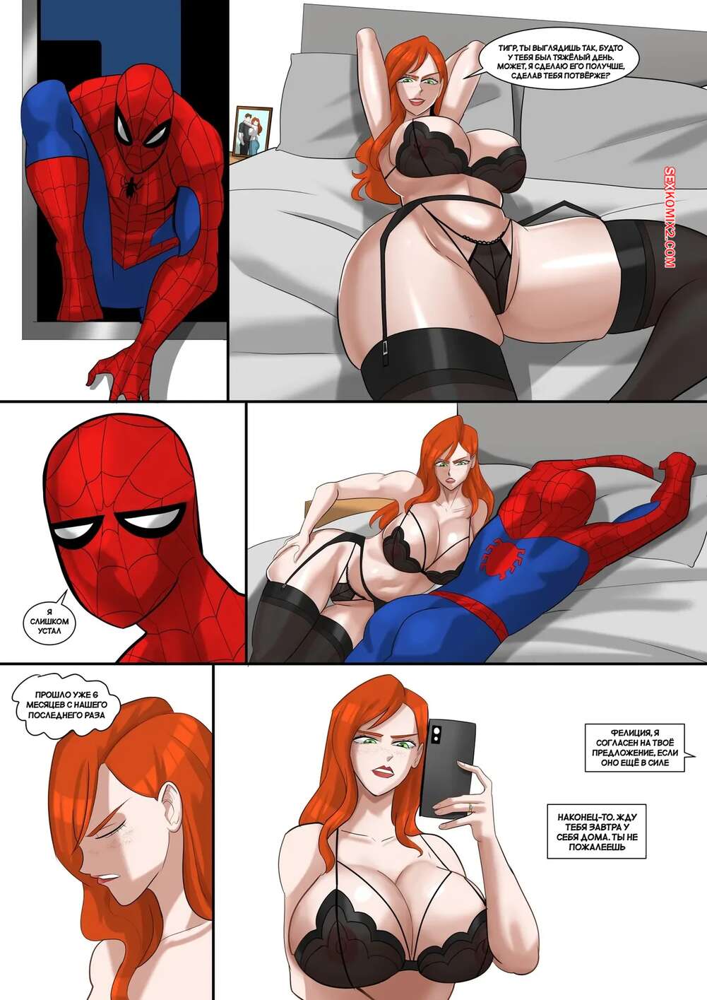 Порно комикс Человек паук. В любви и на войне все средства хороши. Venomarts00 Человек Паук прилетел к Мэри Джейн, которая ждала его в сексуальном белье, но секса не получила. К девушке наведалась Фелиция, которая стала обнимать рыжулю сзади и ласкать ее сиськи.