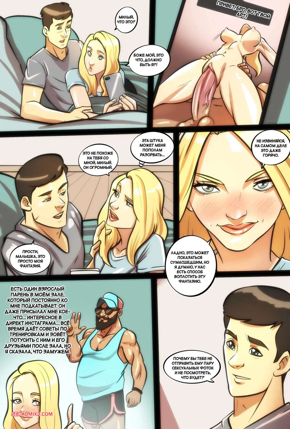 Порно комикс Моя жена королева размера. Часть 1. My Wife Is A Size Queen. Illustravitor. Горячая блондинка устала от маленького члена своего мужа и хочет попробовать чтото побольше. Она пригласила незнакомца к себе домой и позволила ему трахнуть свою пизду, пока ее муж за этим наблюдал.