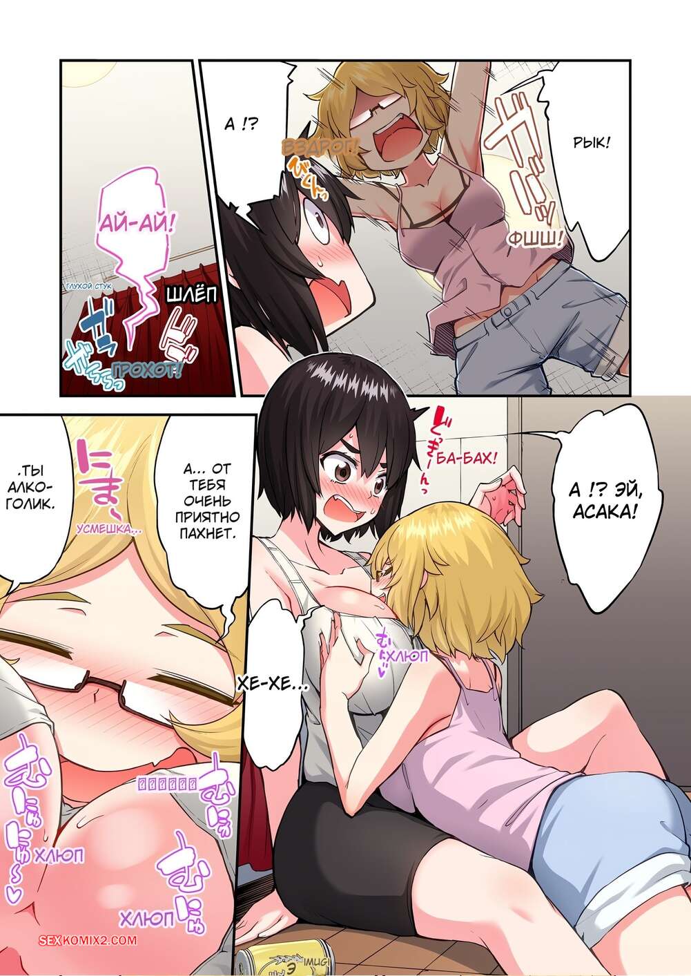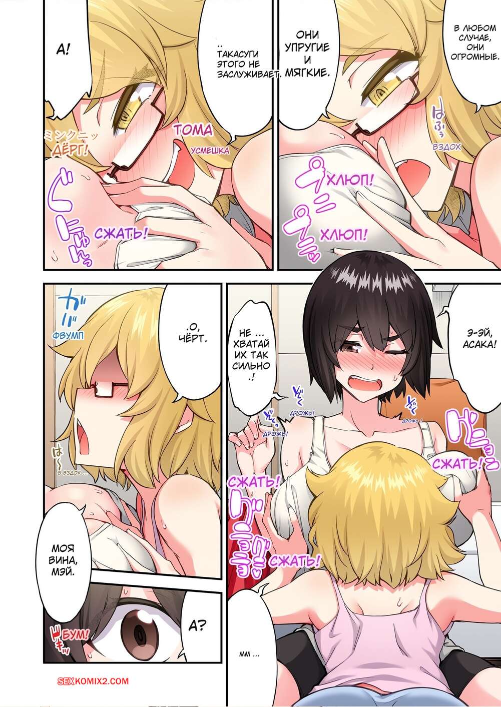 Порно комикс Банщик. Без цензуры. Я и она в женской бане. Часть 196, 197, 198. Toyo Горячая брюнетка заигрывает с блондиночкой, желая пошалить. Он ласкает красотку, но их прервал парень, который сразу возбудился и усадил брюнеточку на свой твердый член.