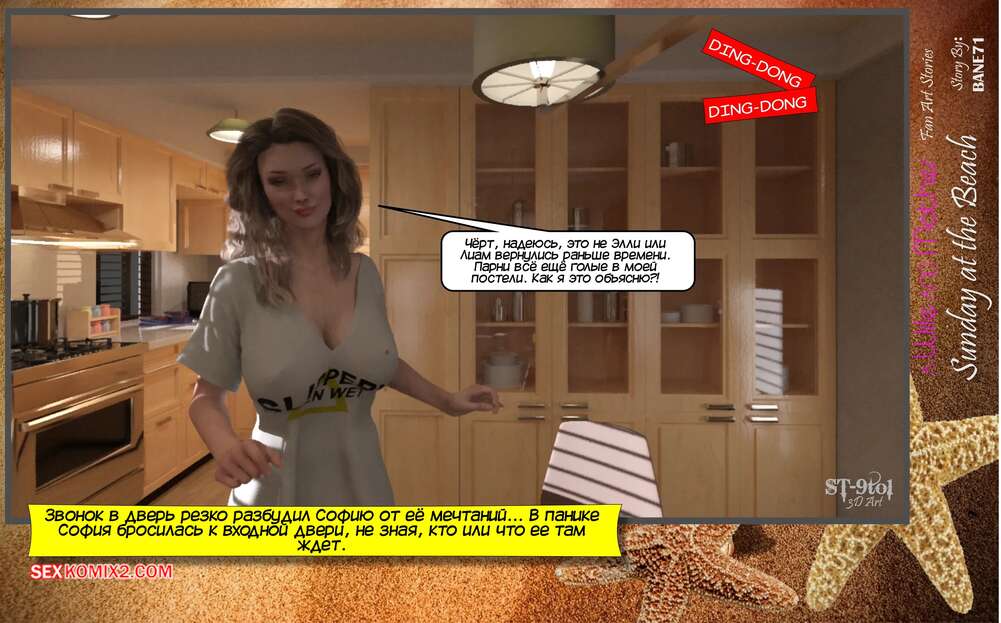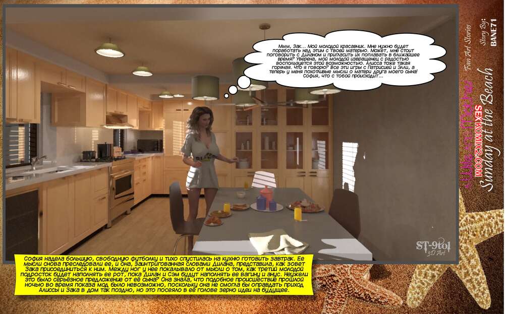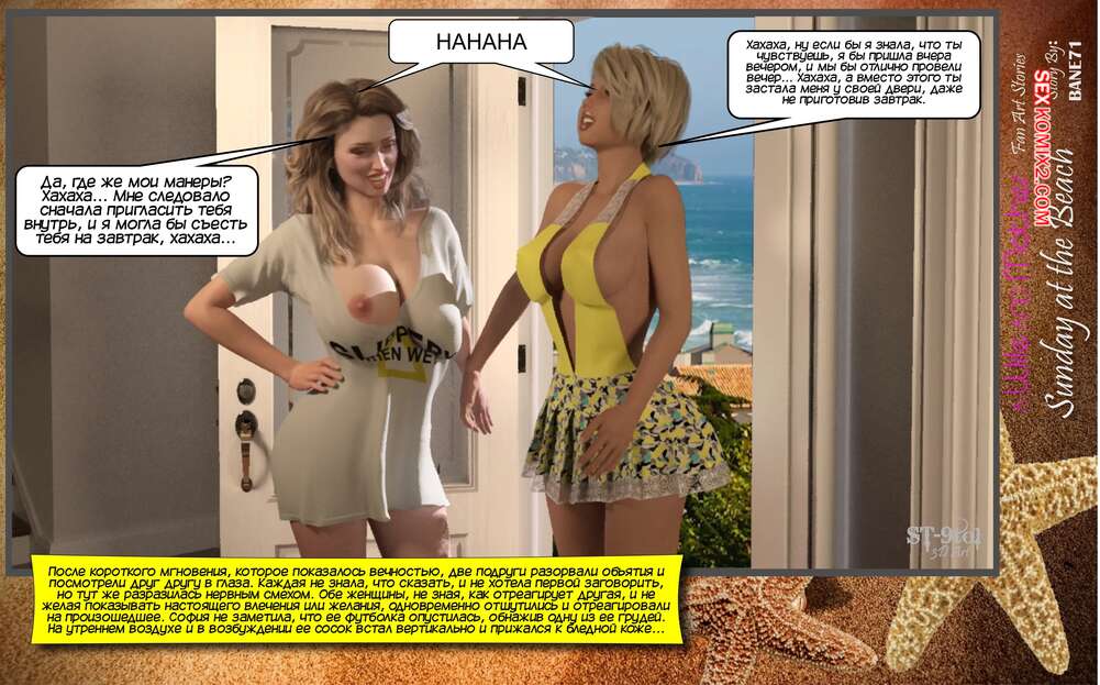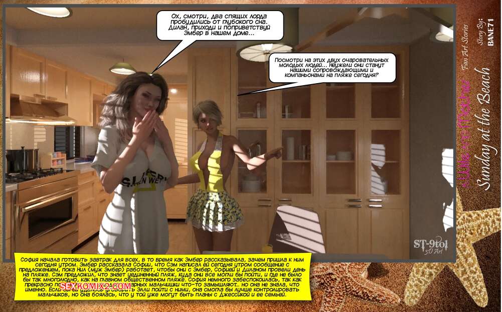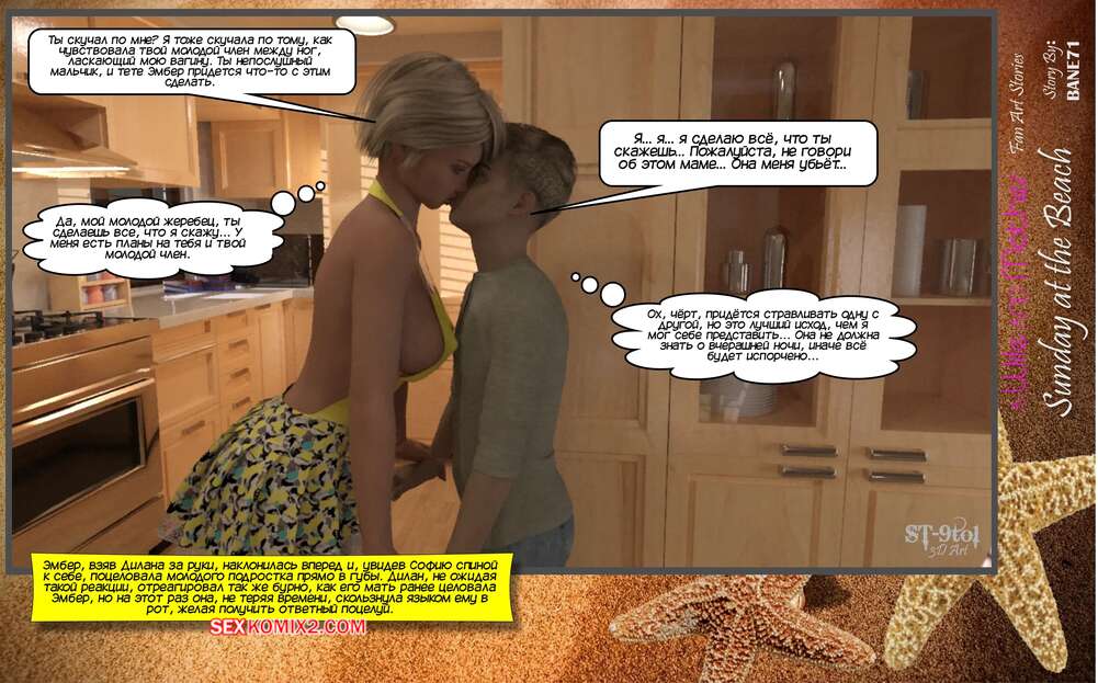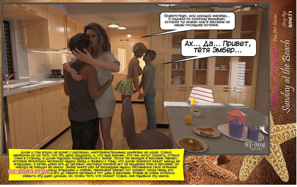 Порно комикс Воскресенье на пляже. Sunday On The Beach. ST9Pol София проснулась в объятиях своего сына и его лучшего друга после невероятной ночи секса. Она пошла вниз готовить завтрак, но ее прервал стук от Эмбер мамы Сэма. Вчетвером они решают отправиться на пляж, где их ждет страстная оргия.