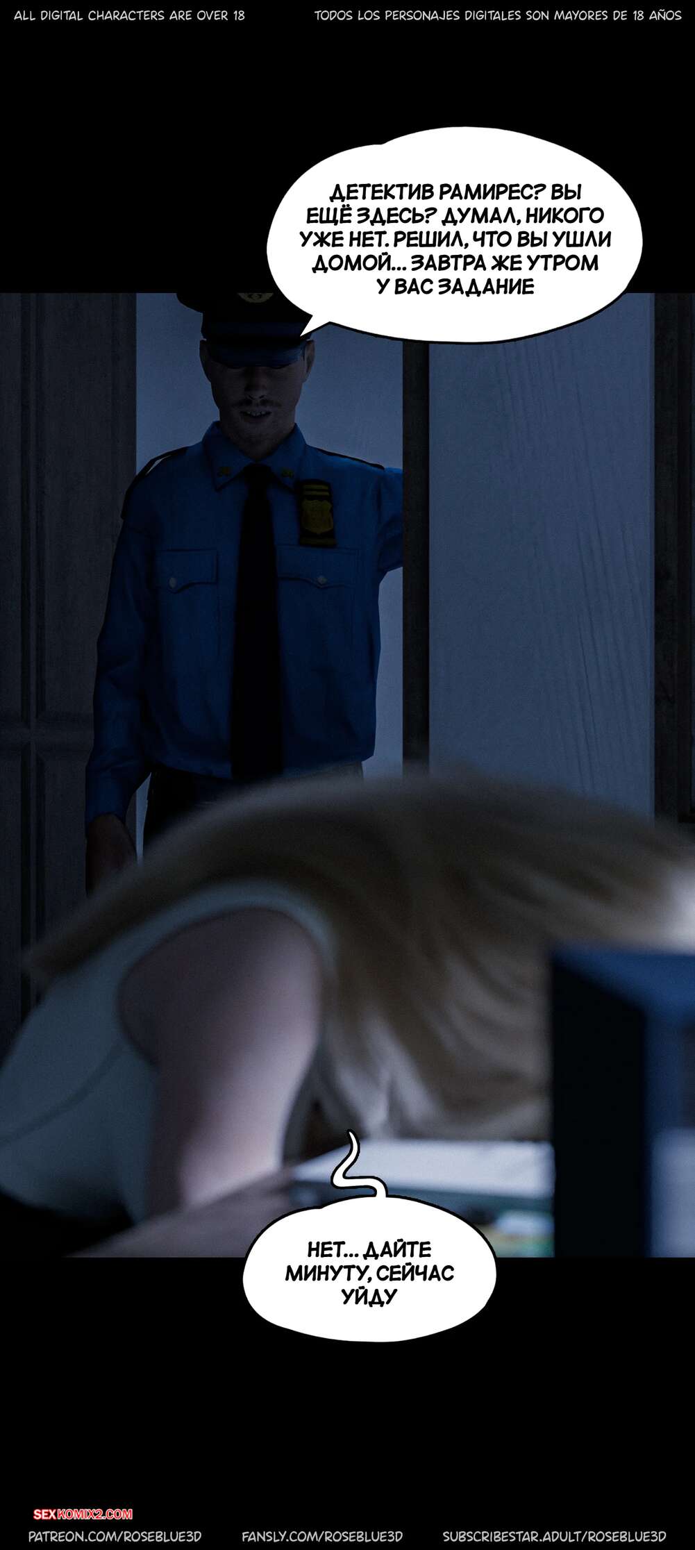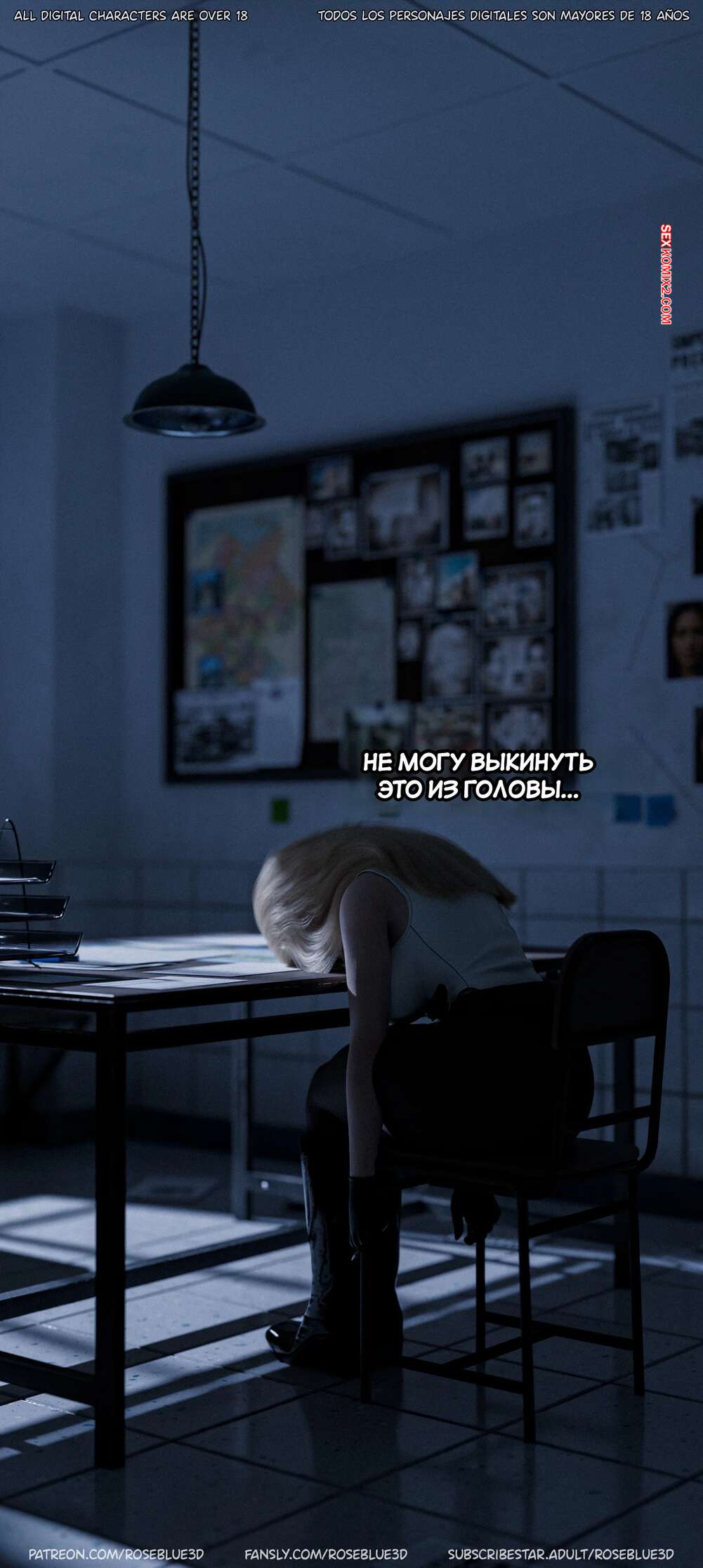 Порно комикс Моя соседская вдова. Часть 52. My Neighbors Widow. Rose Blue 3D Горячая блондинка милфа сидит поздней ночью в своем офисе и работает над делом. Красотке сложно сконцентрировать, ведь она все еще не может выбросить из головы секс Черной вдовы с Алариком.