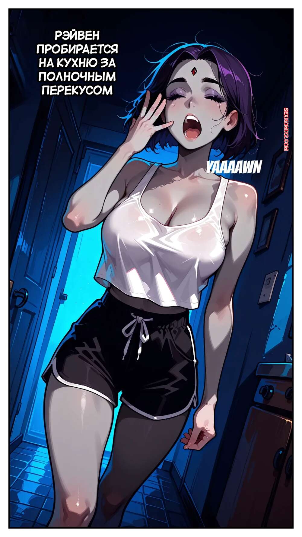 Порно комикс Teen Titans. Рэйвен пробирается на кухню за ночным перекусом. Mittoshura Парни пробрались ночью в комнату Рэйвен, желая повеселиться с брюнеточкой. Они полностью ее раздели, после чего насадили девушку на свои твердые члены и выебали ее в пизду и попку.