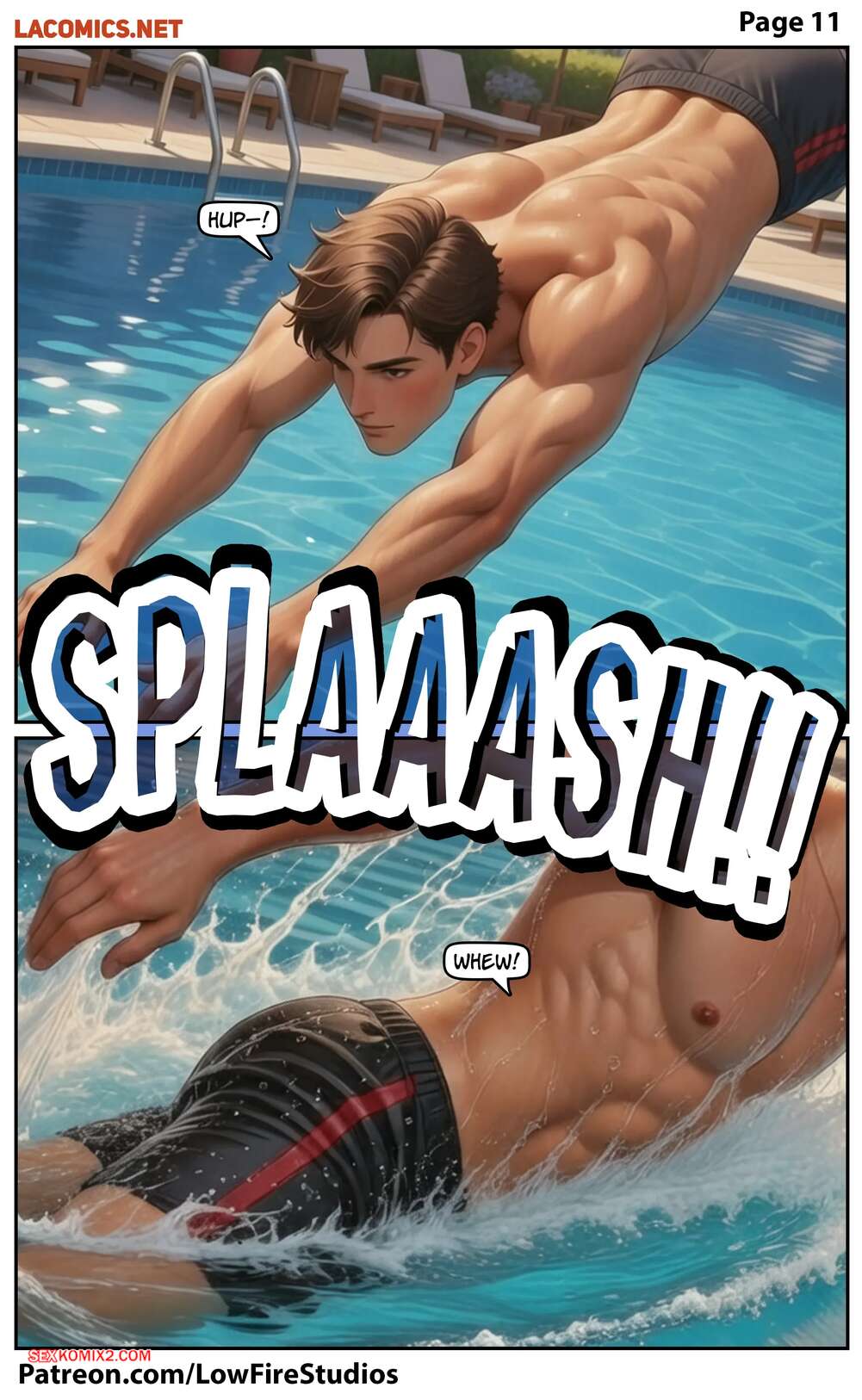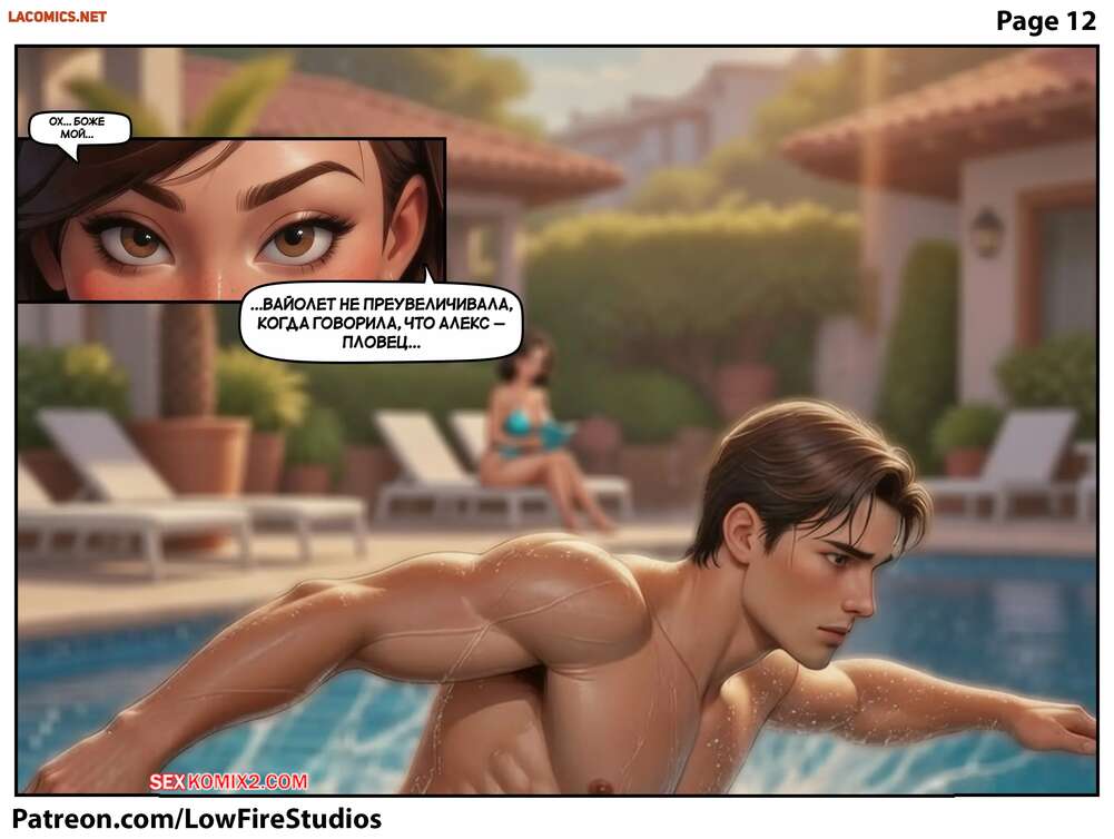 Порно комикс Суперсемейка. Слишком глубоко. Часть 1. A Dip Too Far. LowFireStudios Горячая милфа купалась в бассейне и привлекла внимание парня своей дочери. Он решил воспользоваться моментом наедине с красоткой и стал ласкать ее язычком, возбуждая мамку девушки.