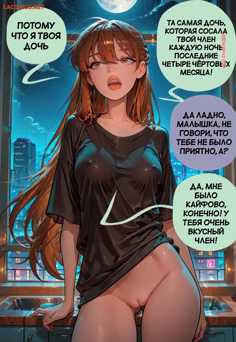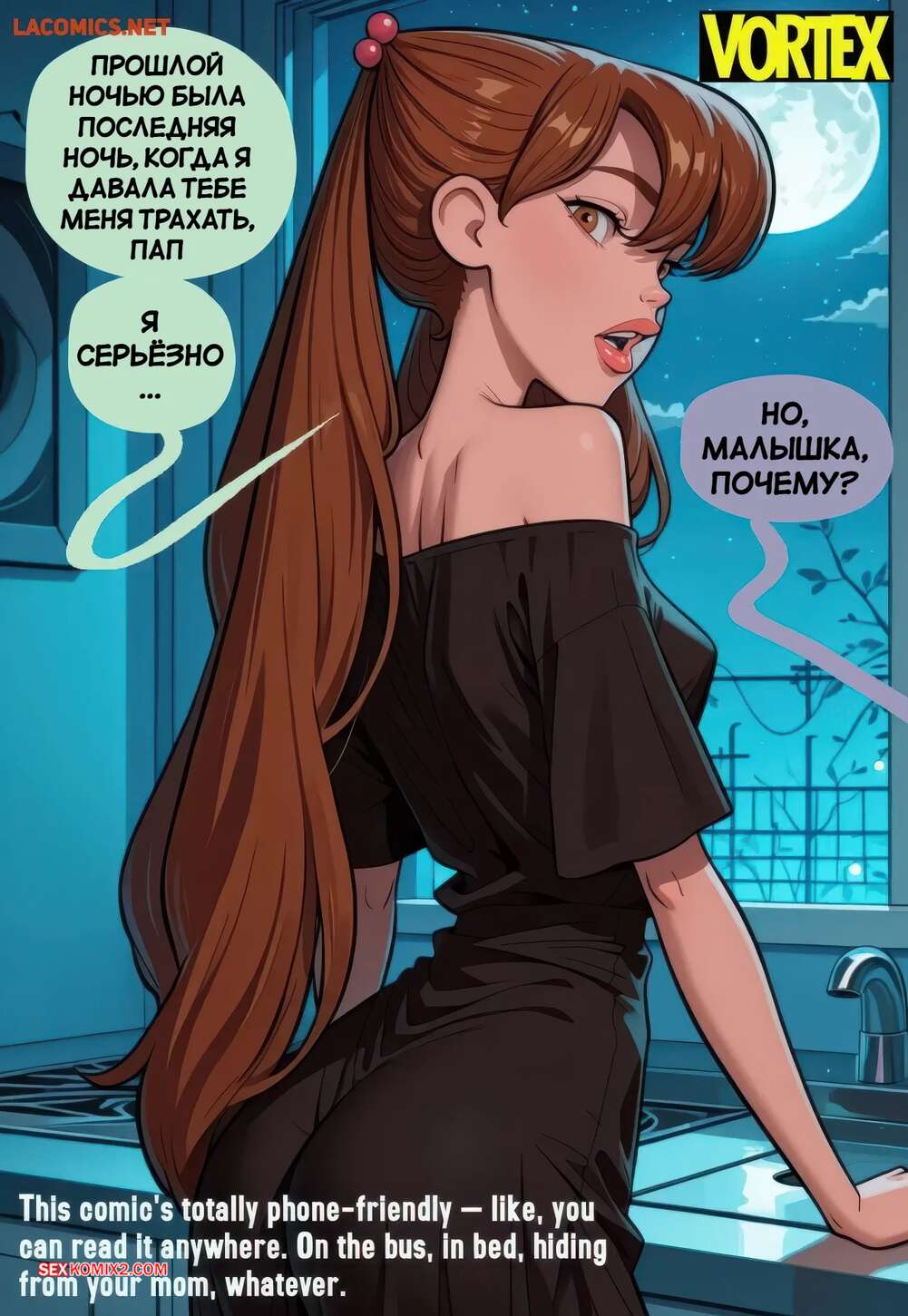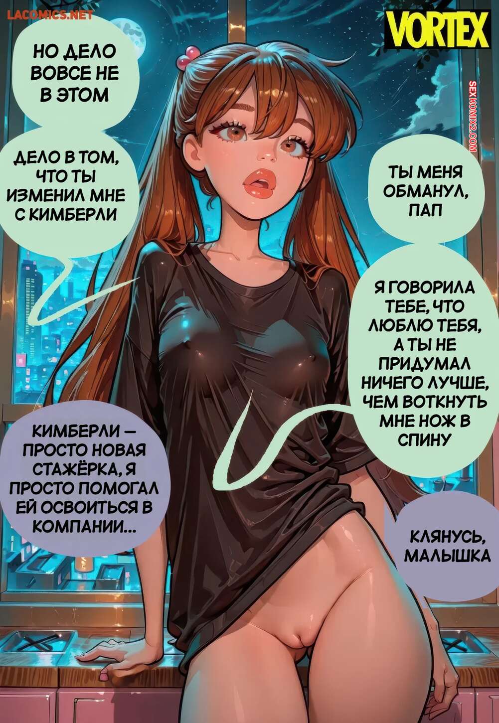 Порно комикс Взрыв Юлии. Julias Blow Up. Vortex. Мужик пришел ночью в комнату к дочери, чтобы повеселиться с аппетитнкой девушкой. Она встала на колени и отсосала большой хуй папочки, после чего раздвинула ножки и дала себя выебать.