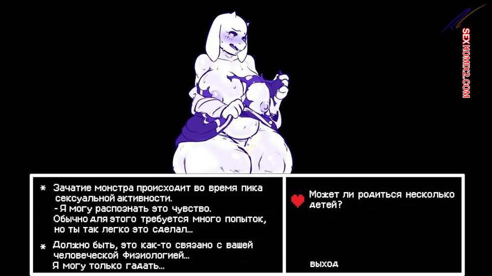 Порно комикс Undertale. Предложение Ториель. Toriels Offer. Pleasure Castle Молодой парень не может устоять перед аппетитным телом красотки Ториэль. Он усадил похотливую милфу на свой член и хорошенько выебал ее пизду и заполнил своей спермой.