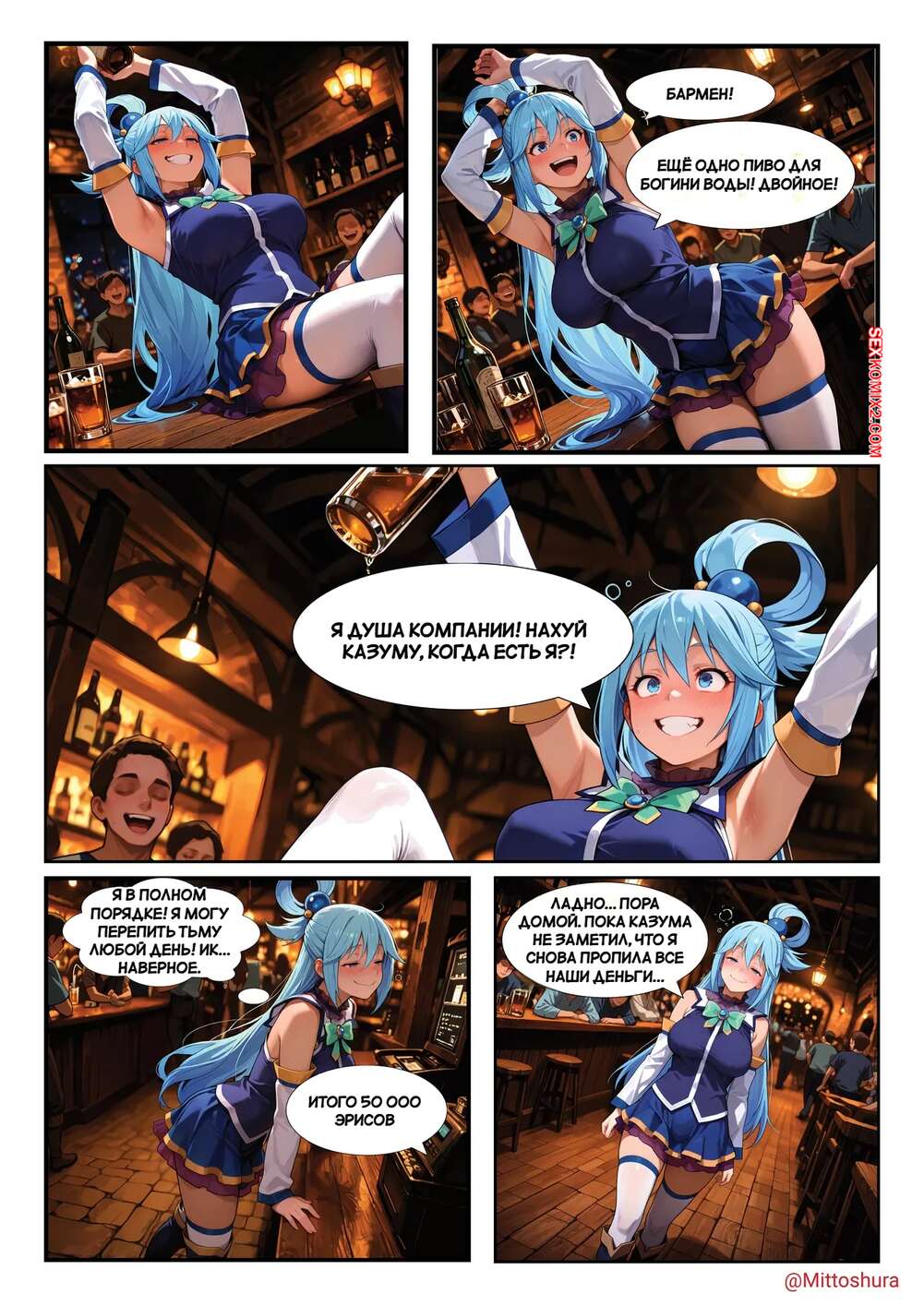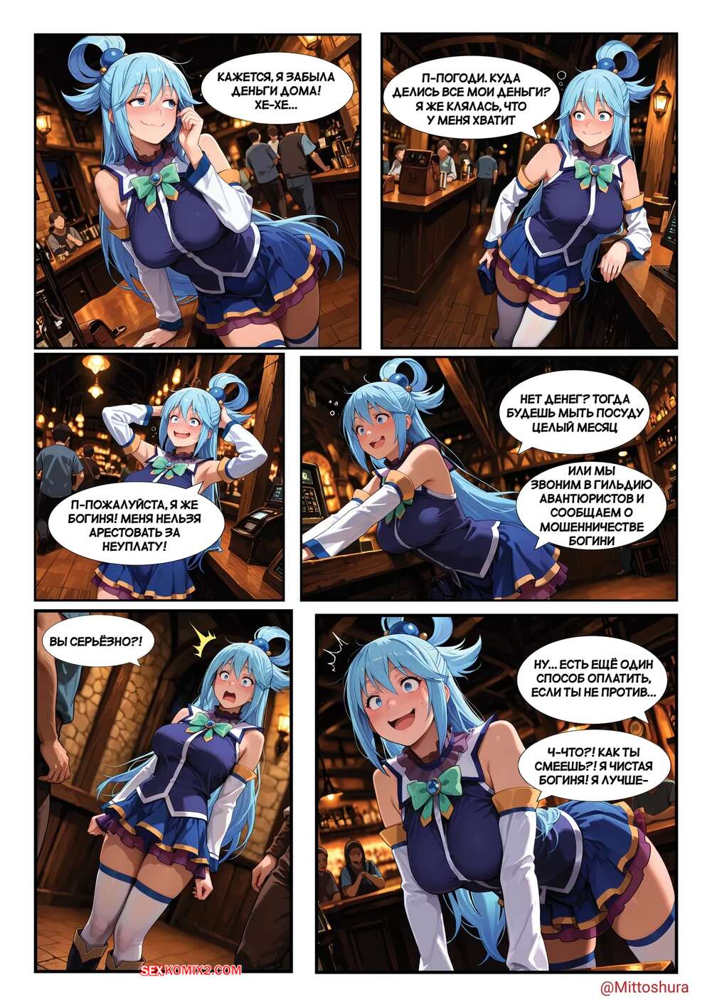 Порно комикс Особый способ оплаты Аквы. Aqua special method of paiment. Mittoshura. Красотка Аква выпивала в баре и привлекла внимание толпы парней. Они поставили сучку на колени и дали ей отсосать свои большие хуи, после чего выебали ее в пизду и задницу.