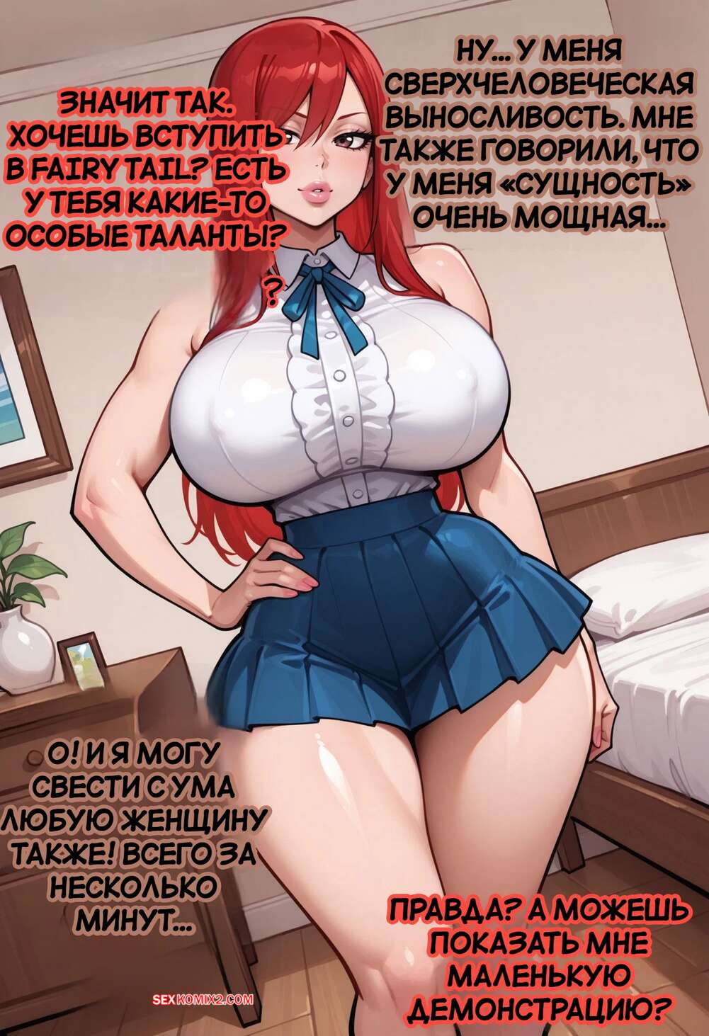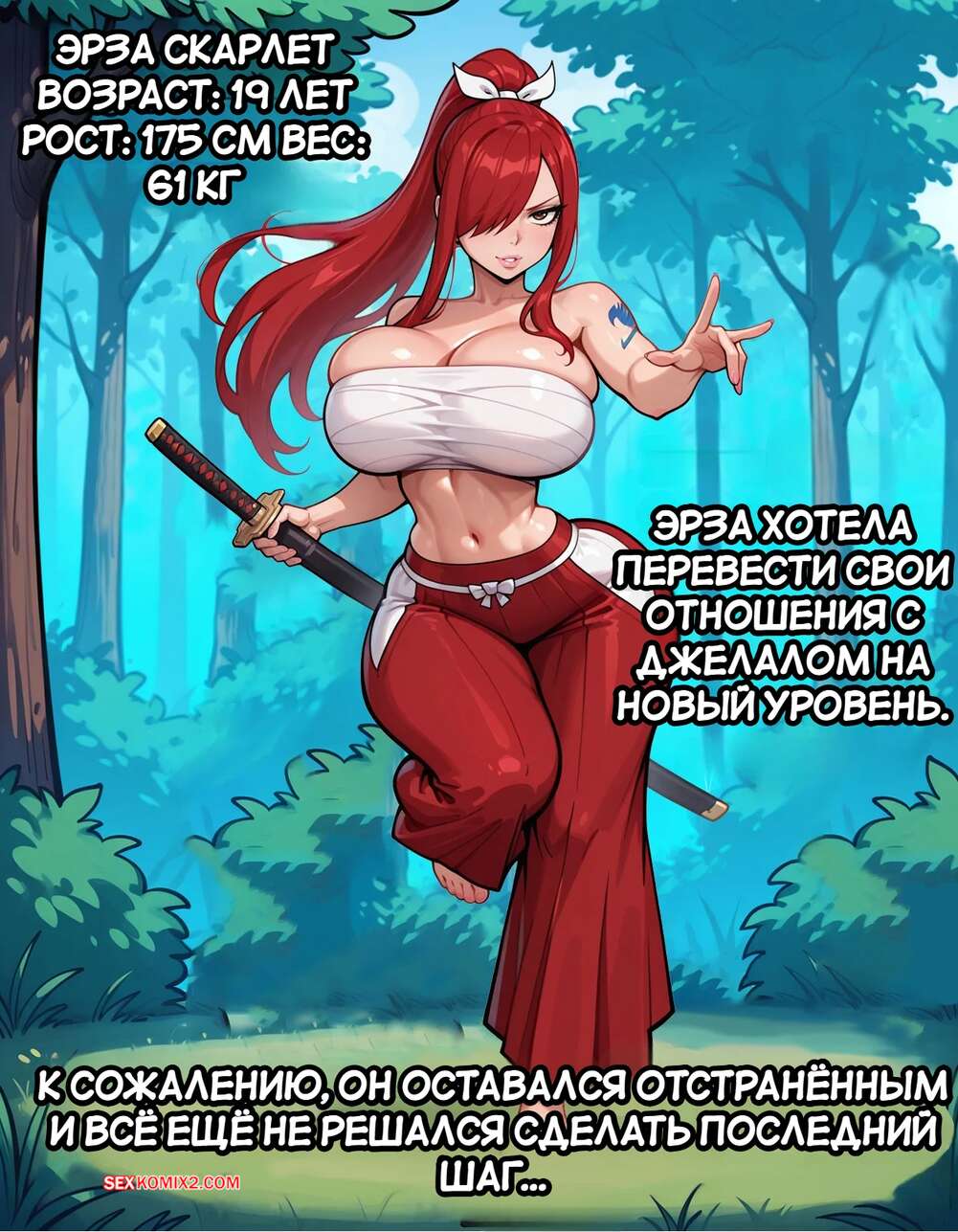 Порно комикс Эрза испытывает нового рекрута. Erza teste une nouvelle recrue. Dartzai. Рыжая красотка Эрза пригласила к себе темнокожего парня, чтобы испытать его. Девушка разделась и отсосала большой хуй парня, после чего раздвинула ножки и дала себя выебать во все дырочки.