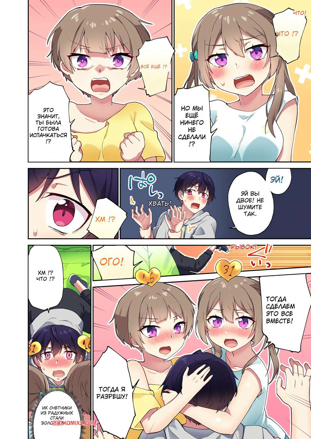Порно комикс Я вижу число оргазмов. Без цензуры. Часть 97 и 98 и 99 Две красотки возбудились и решили повеселиться со своим дружком. Они встали на колени и вместе отсосали его большой хуй, после чего раздвинули ножки и дали себя выебать.