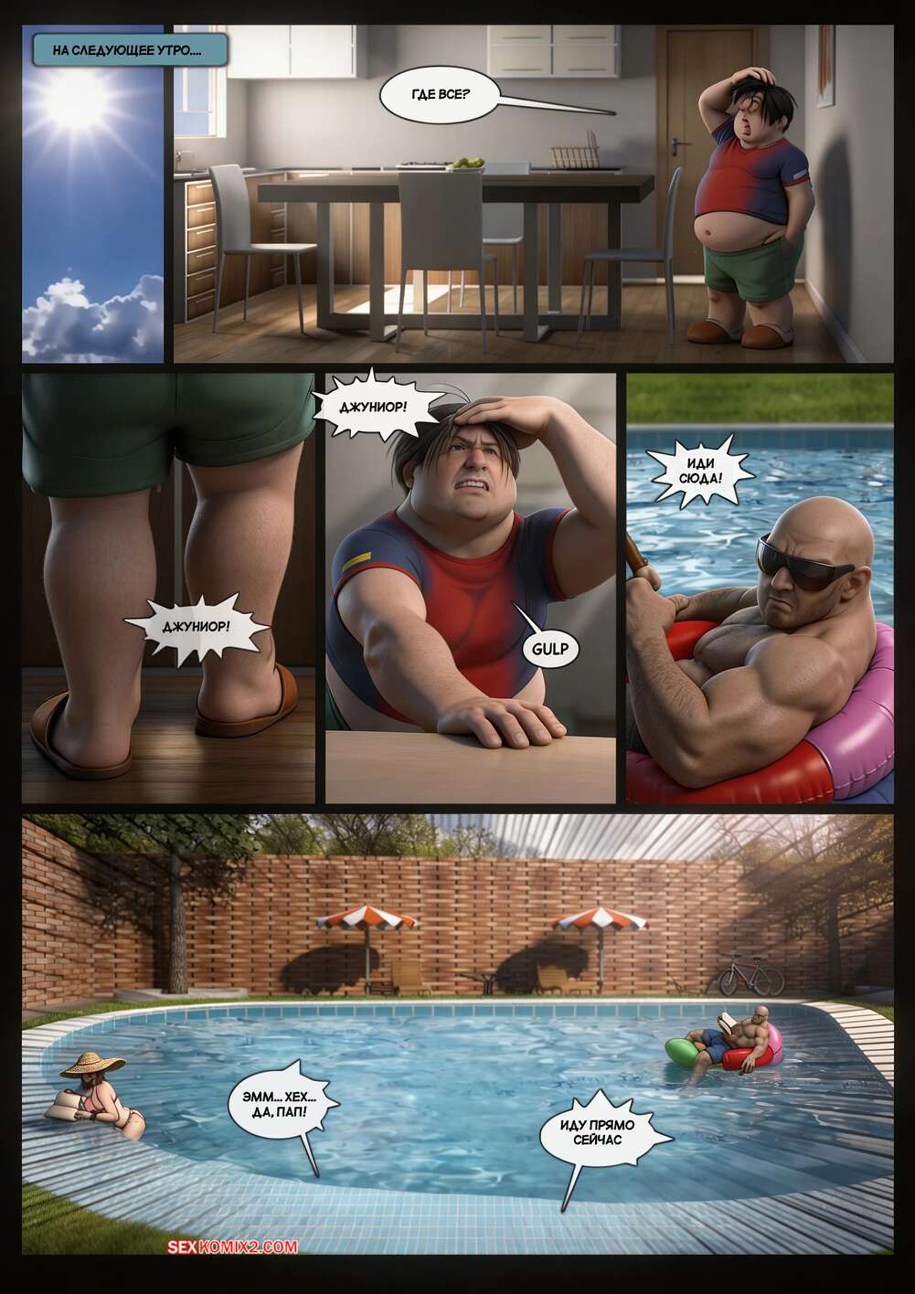 Порно комикс Без интернета. Часть 1. No internet. Milftoon, Peelpaal. Мужик отключил интернет своему сыну и теперь парень переключил свое внимание на горячую мамочку. Он подкатывает к красотке в бассейне и трется членом о ее задницу, желая снять напряжение.