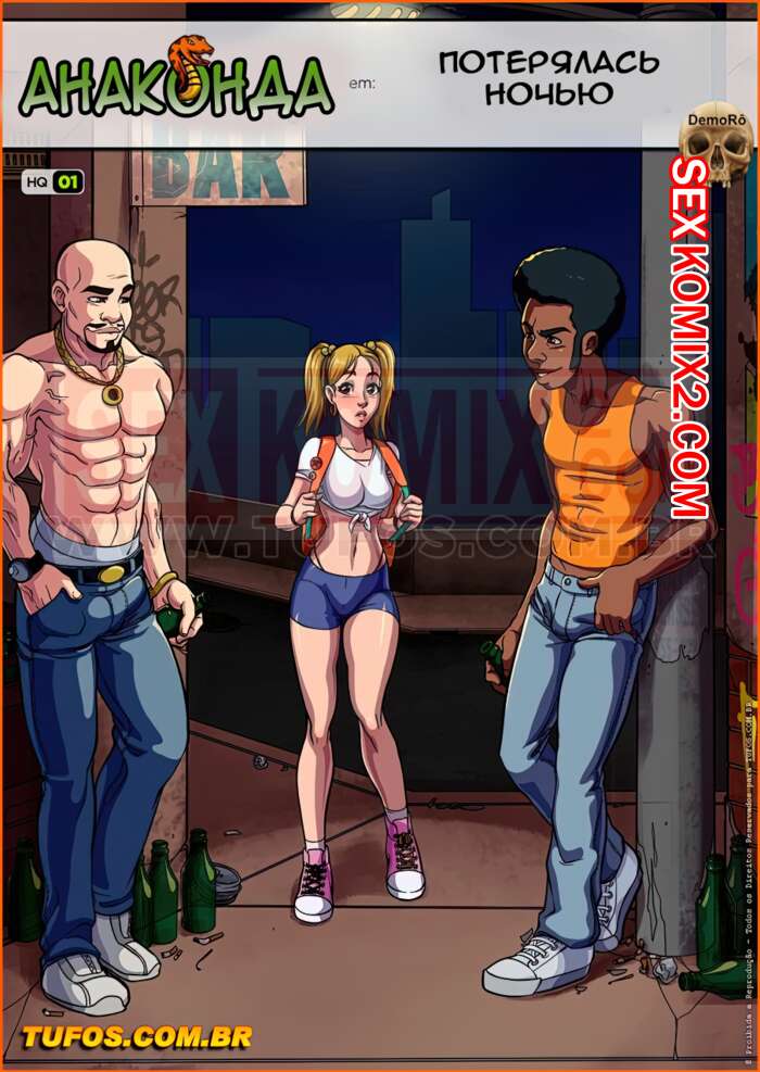 Порно комикс Анаконда. Часть 1. Потерялась ночью. Молодя девушка блондинка до поздно гуляла по городу и заблудилась под вечер, она поняла что зашла в неблагополучный район, когда двое чернокожих парней подошли к ней познакомится и заняться сексом.
