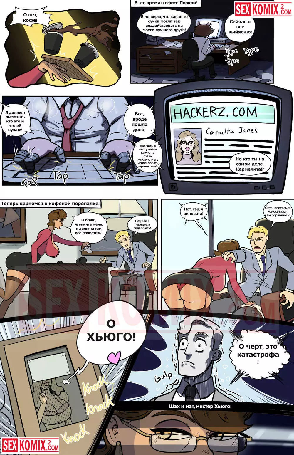 Порно комикс Секретарь Джонс. Развратный босс вышел на работу после долгого отпуска, он плавал на круизном лайнере и трахал там горячую блондинку. Мужчина с радостью рассказывал об этом своим работникам. А чтобы доказать, что он действительно такой крутой как рассказывает, босс трахнул свою секретаршу.