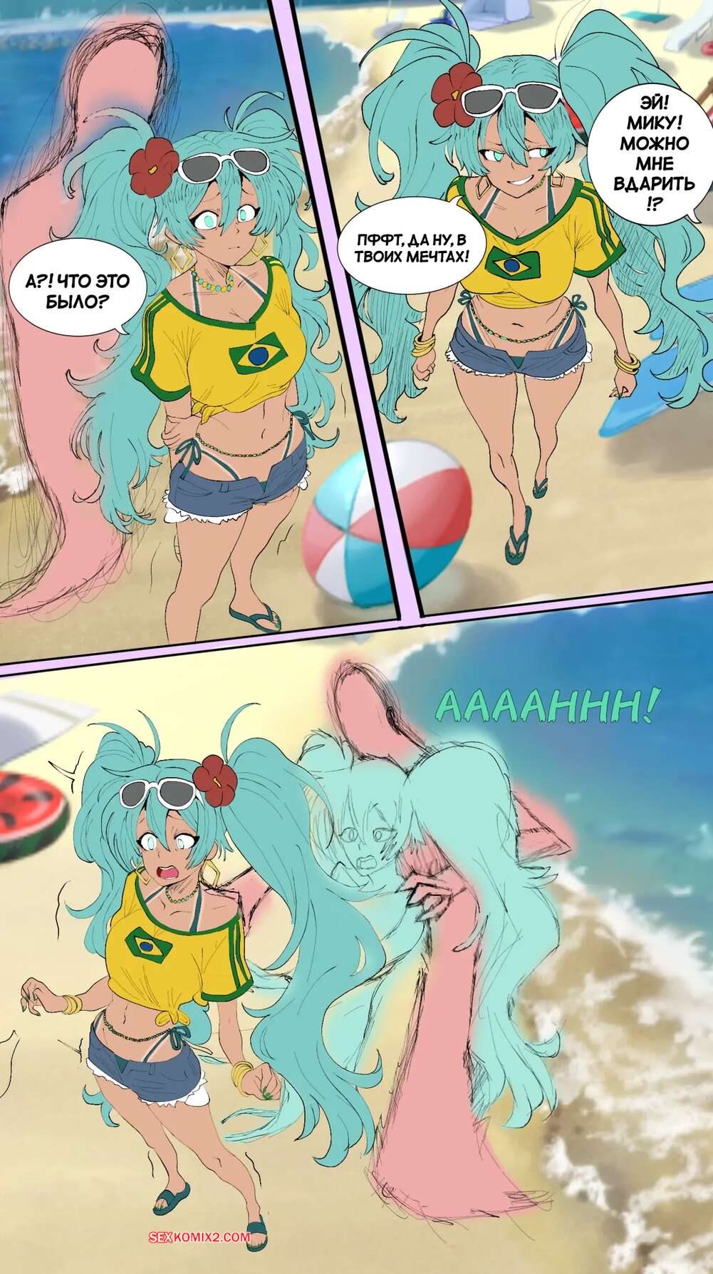 Порно комикс Мику. Miku TSF. funflo. Красотка Мику пришла на пляж, где осталась лишь в купальнике и привлекла внимание парня своим шикарным телом. Он повел девушку в уединенное место, где хорошенько ее выебал.