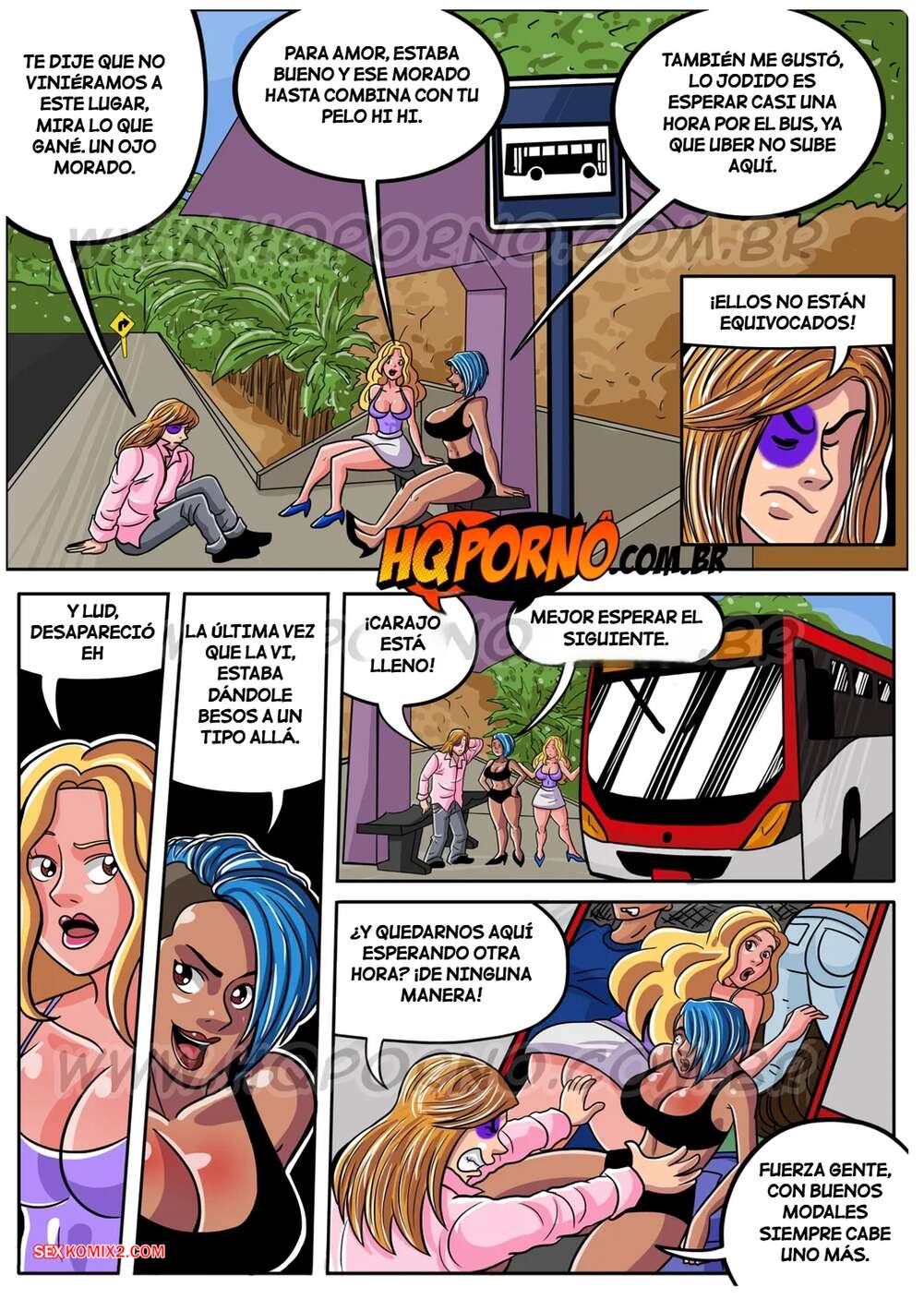 Comic porno As Putianes. Parte 3. HQPorno Los amigos regresaban de una fiesta y se encontraron en un autobús lleno de gente. Allí, los chicos empezaron a coquetear con Anita y la excitaron, así que ella accedió a practicarles sexo oral y a que la follaran.